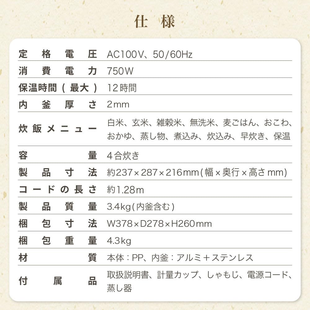 * Номинальное напряжение: AC100V, 50/60Hz * Потребляемая мощность: 750 Вт * Время сохранения тепла (максимум): 12 часов * Толщина внутренней части горшка: 2мм * Меню приготовления риса: Белый рис, коричневый рис, смешанный рис, непромытый рис, ячменный рис, рисовый рис, рисовая каша, приготовление на пару, тушение, варка, быстрое приготовление, поддержание тепла * Вместимость: 4 чашки * Размеры продукта: приблизительно. 237 х 287 х 216 мм (ширина х глубина х высота мм) * Длина шнура: приблизительно. 1,28 м * Масса продукта: 3,4 кг (включая внутренний горшок) * Размеры упаковки: Ш378 x Г278 x В260 мм * Вес упаковки: 4,3 кг * Материалы... - Основная часть: ПП - Внутренний горшок: Алюминий + нержавеющая сталь * Аксессуары: Инструкция по эксплуатации, мерный стакан, совок для риса, шнур питания, пароварка