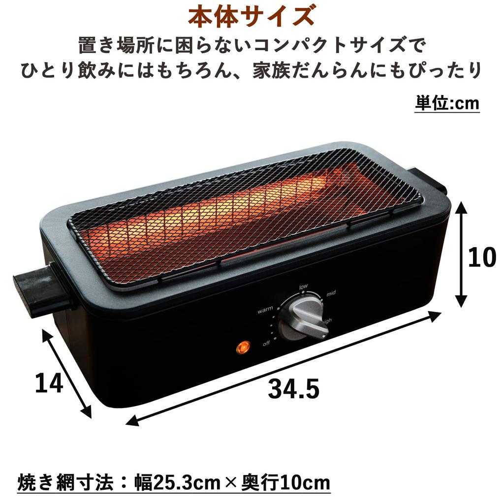 [Характеристики продукта] ◇ Размер корпуса: Ширина 34,5 x Глубина 14 x Высота 10 см ◇ Размеры сетки: Ширина 25,3 x Глубина 10 см ◇ Вес тела: 1,3 кг ◇ Длина шнура питания: 1,2 м ◇ Источник питания: Переменный ток 100 В (50/60 Гц) ◇ Потребляемая мощность: 1000 Вт ◇Гарантийный срок: 1 год с момента покупки (Пожалуйста, проверьте инструкцию по эксплуатации, чтобы узнать объем гарантии.. (Неисправности и повреждения, возникшие при использовании в целях, отличных от общего бытового использования (коммерческое использование и т.д.) гарантия не распространяется.)