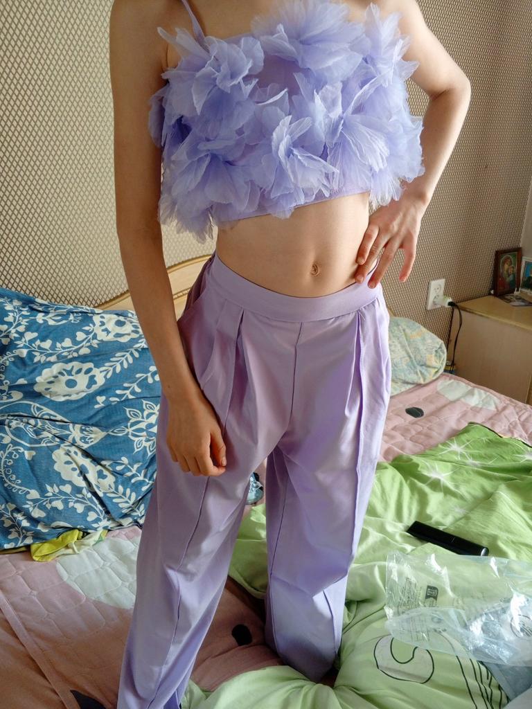 Топ сшит из шифон, ткань мягкая, приятная в верхней части двойная (до груди). Ткань почти не прозрачная.