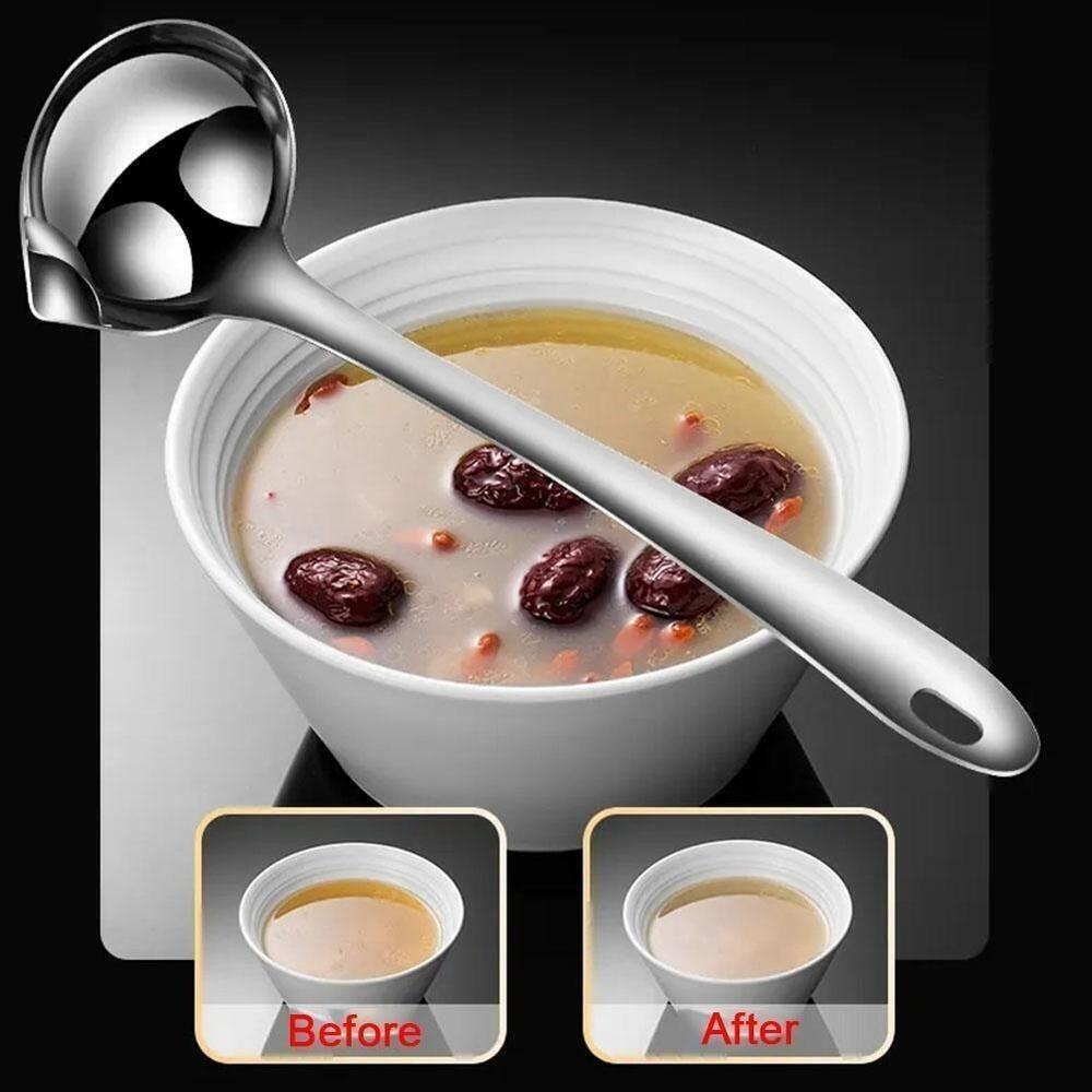 Многофункциональная конструкция ложки: Эта ложка из нержавеющей стали может не только использоваться как традиционная ложка, но также может очень хорошо разделять жир и остатки супа.. Во время использования суповый сок вытекает из небольшого отверстия, чтобы отделить жир от супа.. Пейте прозрачный суп и ешьте здоровую пищу.