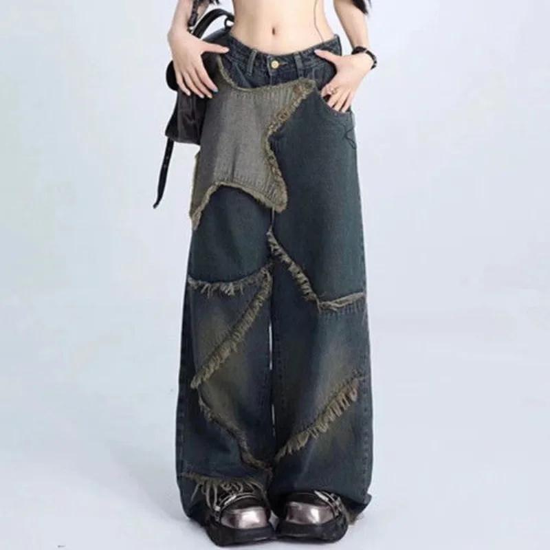 Y2k винтажные женские джинсы Harajuku Star Patchwork широкие корейские джинсовые брюки стираные мешковатые брюки уличная одежда — купить товар онлайн с бесплатной доставкой по всему миру!