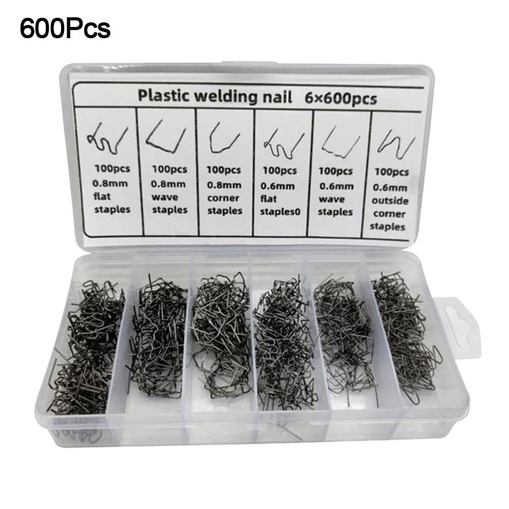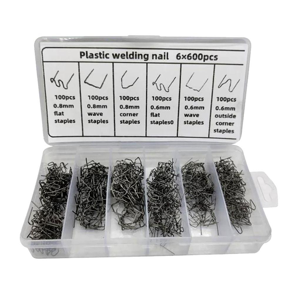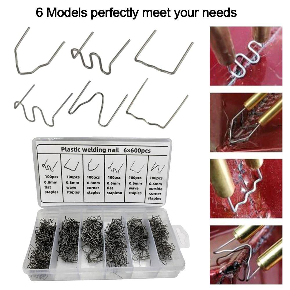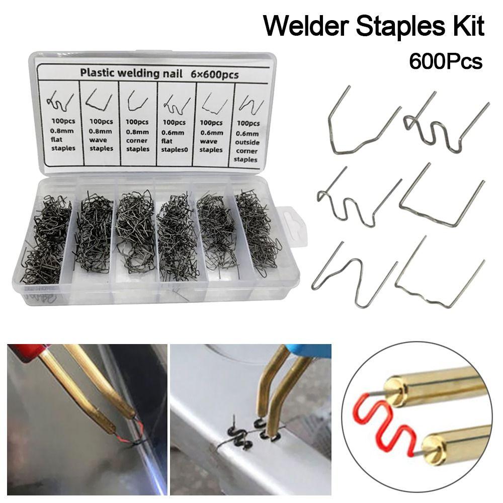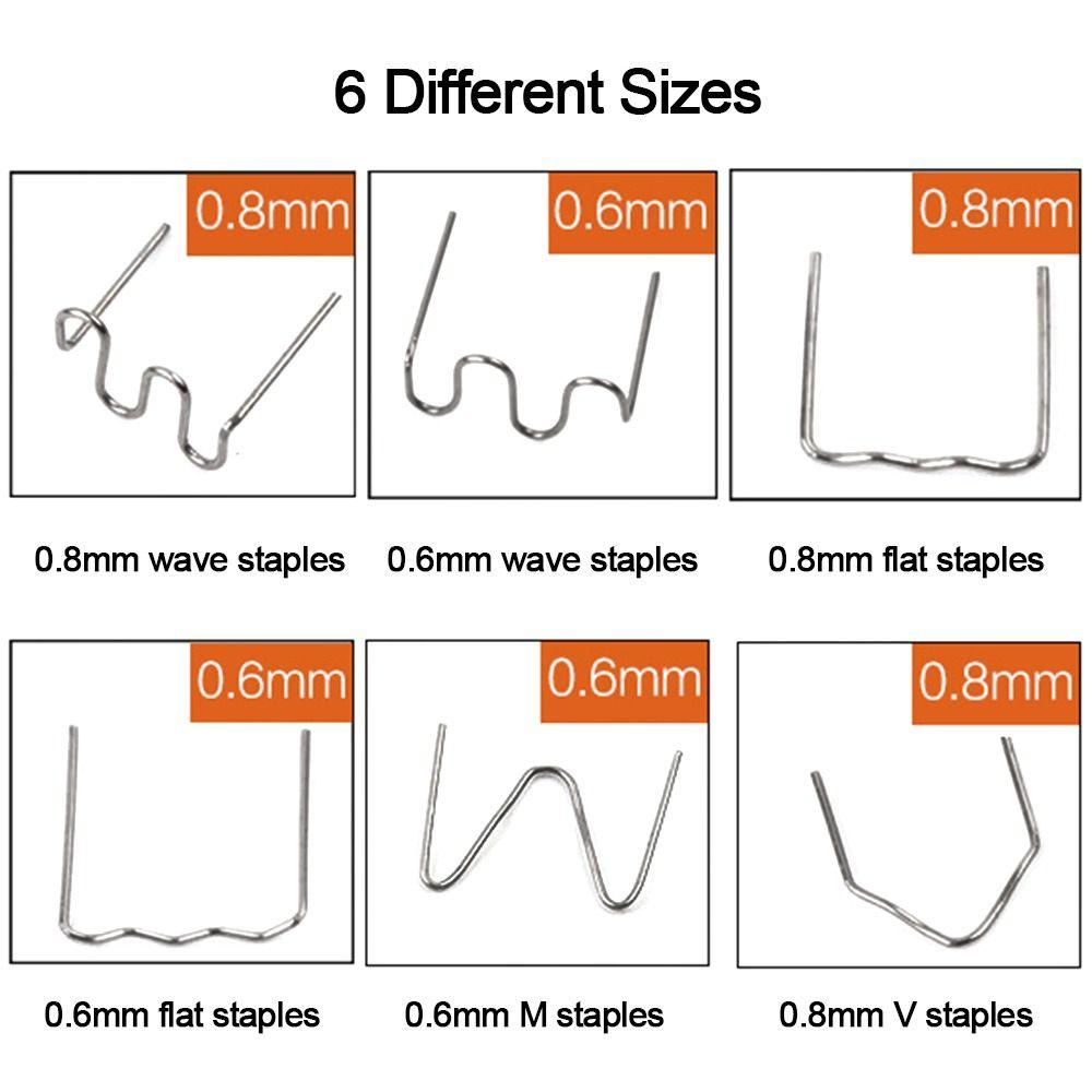 【6 разных размеров】:В комплект поставки входят волнистые скобы 0,6 мм, волнистые скобы 0,8 мм, плоские скобы 0,6 мм, плоские скобы 0,8 мм, V-образные скобы 0,8 мм, скобы M 0,6 мм., всего 6 сварочных аппаратов различных размеров, всего 600 шт.. Количество достаточно, чтобы удовлетворить ваши различные ремонтные работы для бамперных автомобилей, передней и задней перегородки автомобилей. Подходит для младших сварочных операторов.