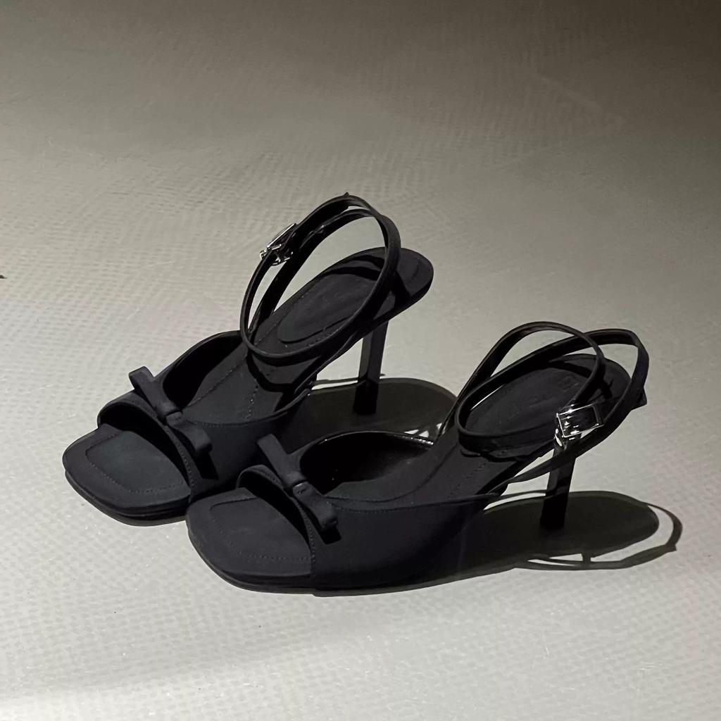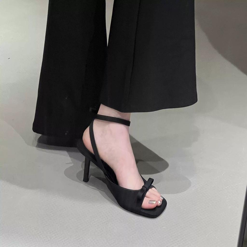 Туфли на высоком каблуке с открытым носком и бантом, новая летняя мода, французский темперамент, черные босоножки