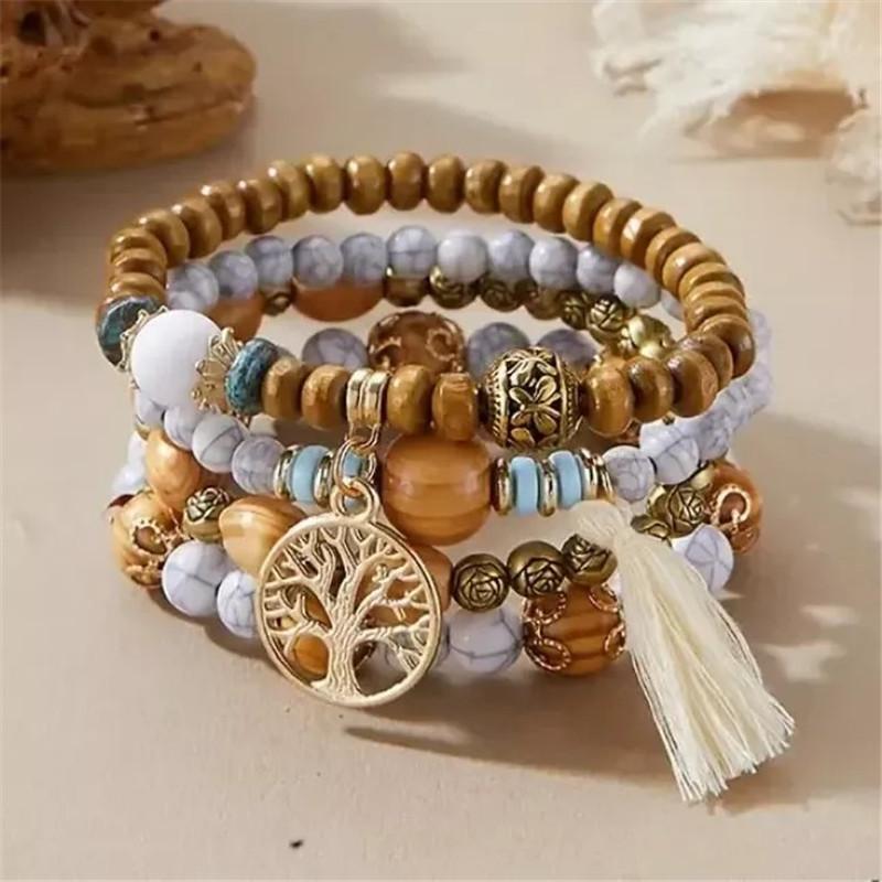 Браслет из натуральных деревянных бусин в этническом стиле «Дерево жизни» в стиле бохо-шик — многослойный набор