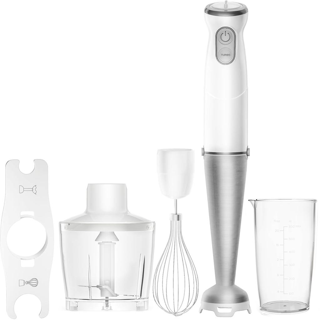 [Многофункциональное, экономящее время приготовление пищи с 6 функциями в 1 устройстве] 4 кухонных принадлежности: В многофункциональный блендер QOOQOOGE интегрированы блендер, миксер, измельчитель и венчик.. Просто заменяя аксессуары, вы можете приготовить шесть различных блюд.: «измельчать», «смешивать», «рубить», «раздавливать», «размешивать» и «взбивать». Вы можете не только создавать простые рецепты, такие как детское питание, супы, суфле и смузи, но и мгновенно завершать утомительные приготовления, такие как тертая редька, рубленое мясо и рубленая морковь.. Вы можете наслаждаться широким выбором рецептов, не тратя много времени и усилий.