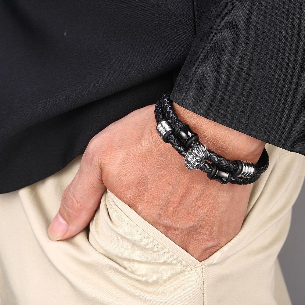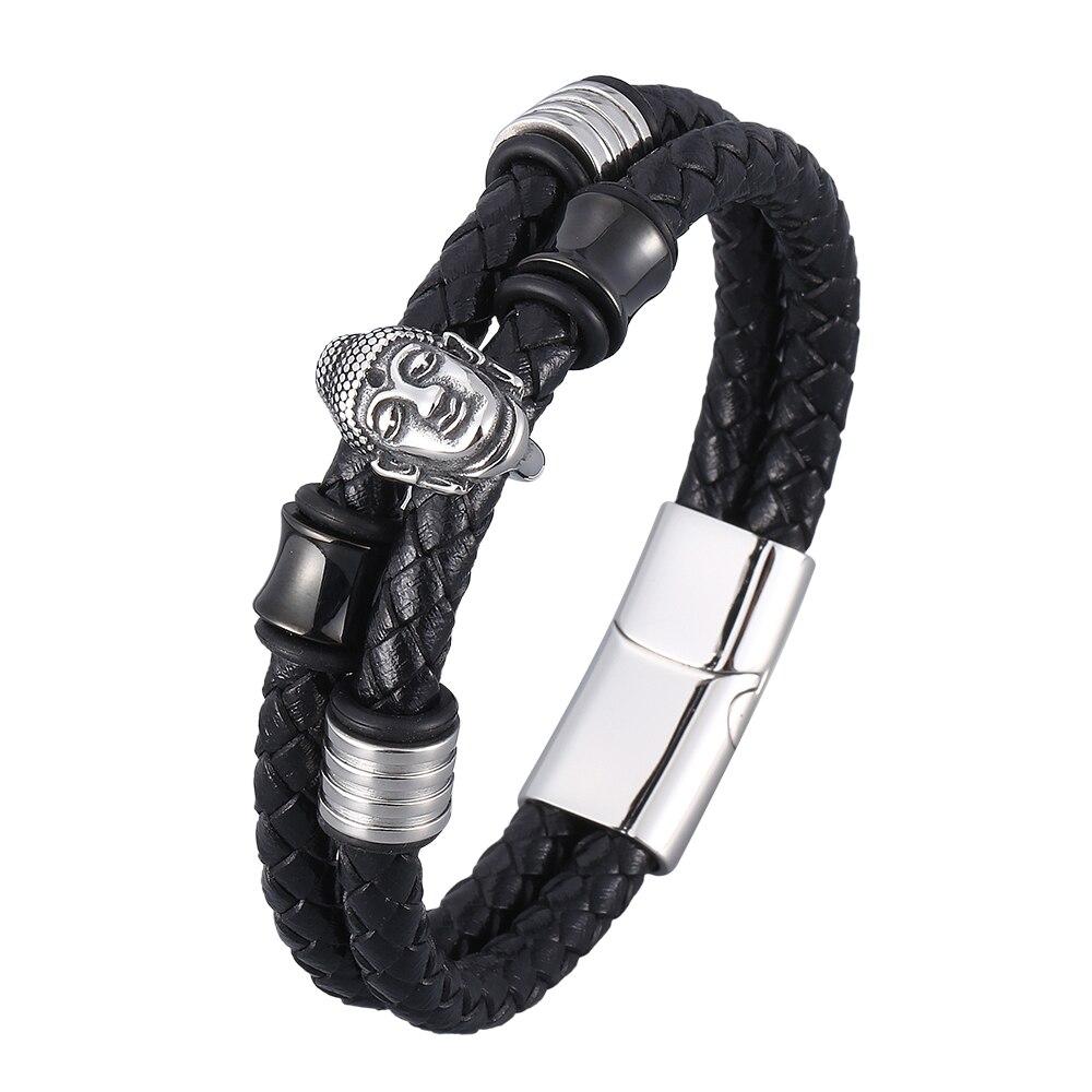 Мужские браслеты из нержавеющей стали с головой Будды, модный двойной плетеный кожаный браслет