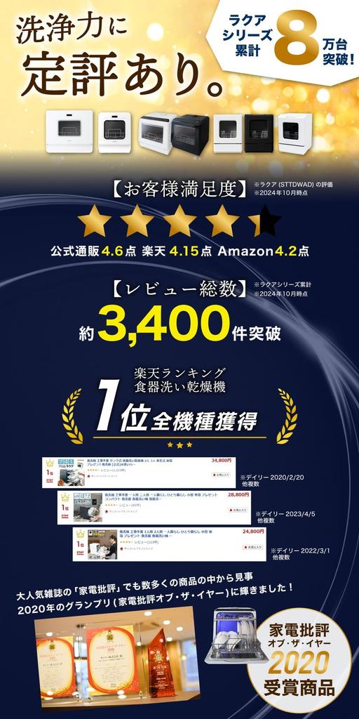[W-образная насадка улучшает эффективность очистки! Rakua mini Plus — небольшая посудомоечная машина, не требующая никаких строительных работ] Rakua mini — сверхкомпактная посудомоечная машина, не требующая никаких строительных работ и которую можно установить даже в арендованном помещении, теперь доступна с улучшенной мощностью очистки! Он превратился в двойную насадку, сохранив при этом простоту использования.. Мойте посуду для двух человек лучше, чем когда-либо прежде.