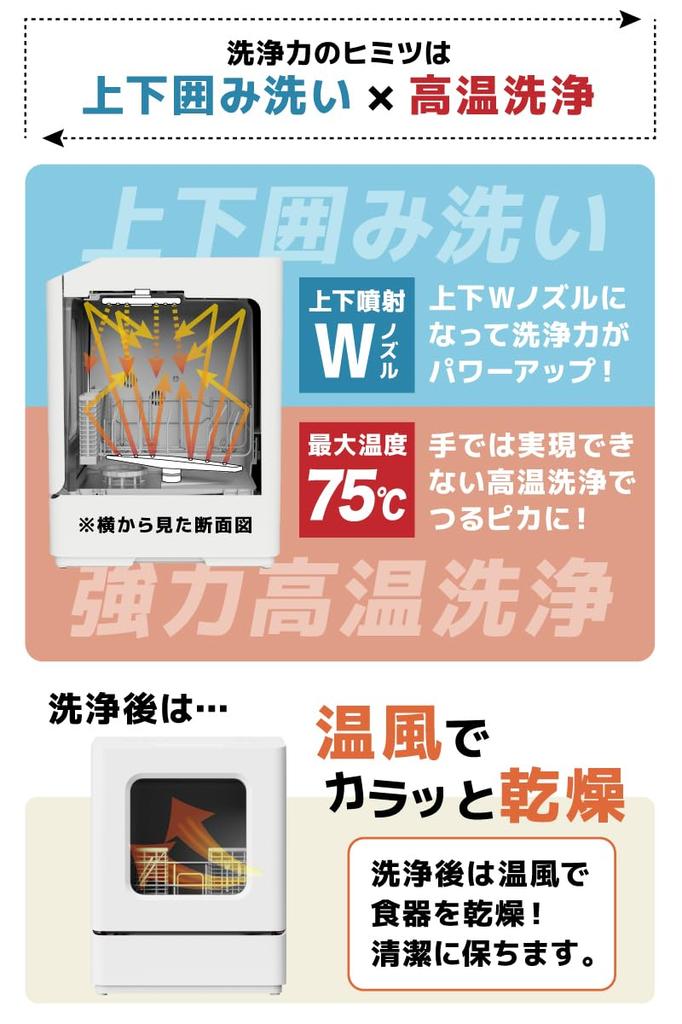 [Мощная очистка верхней и нижней окружностей насадки W] Добавление насадки сверху позволяет мыть верхнюю и нижнюю окружающие области насадки W.. А если добавить к этому высокотемпературную очистку, то очищающая способность станет еще мощнее! [Маленький, но супермощный! ] Секрет в высокотемпературной очистке, которую невозможно достичь вручную.. Добавив сверху насадку, можно мыть верхнюю и нижнюю W-образные насадки.. А если добавить к этому высокотемпературную очистку, то очищающая способность станет еще мощнее! Даже самые стойкие масляные пятна будут тщательно очищены горячей водой температурой до 75℃.