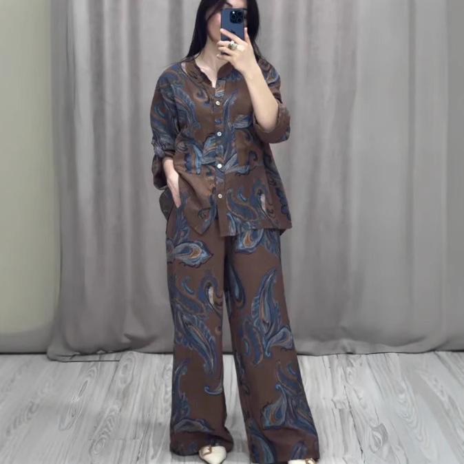 Женский комплект из 2 предметов с винтажным принтом, весенняя рубашка с V-образным вырезом и длинными рукавами, широкие брюки на шнуровке, летний костюм из 2 предметов на пуговицах — купить товар онлайн с бесплатной доставкой по всему миру!