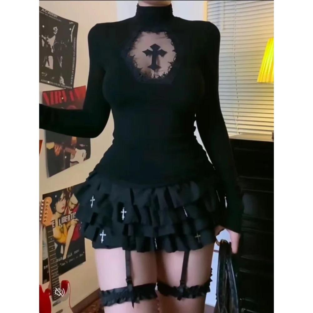 Водолазка Топ Y2k Одежда Черный Готический Крест Полый Утягивающий Низ Футболка для Женщин Длинный Рукав Сексуальная Футболка Топы Для Девочек — купить товар онлайн с бесплатной доставкой по всему миру!
