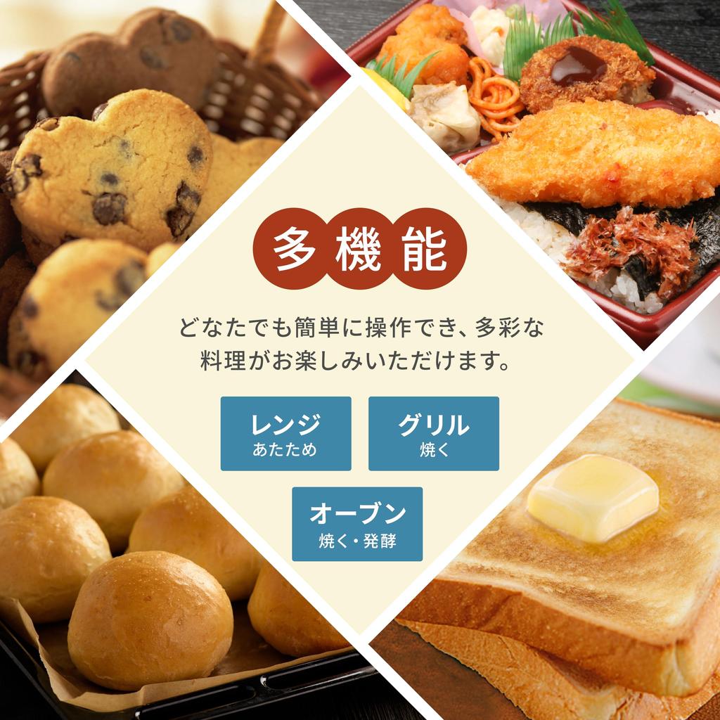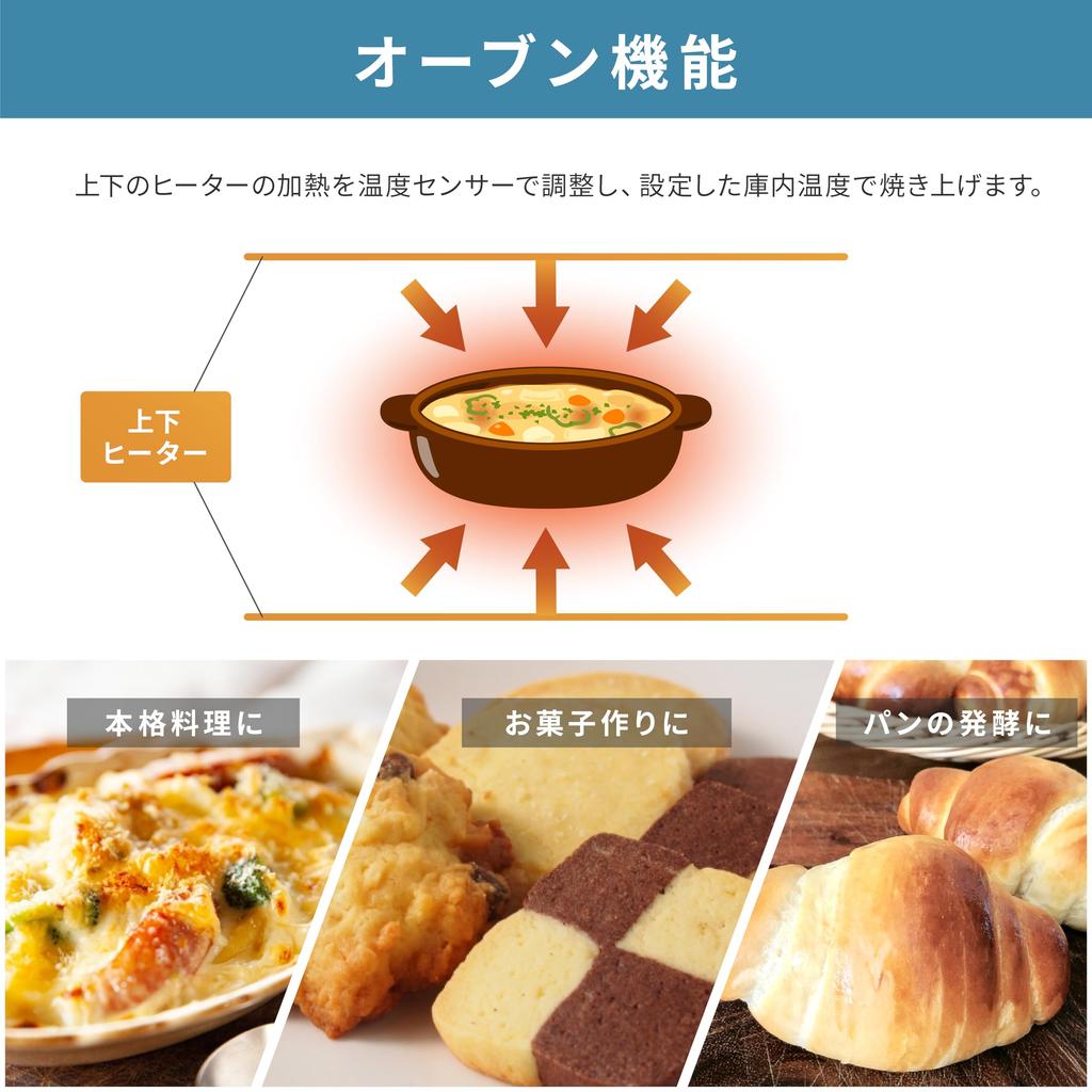 [Функция духовки] Функция духовки, которую можно настроить на температуру до 200℃. Нагрев верхнего и нижнего нагревателей регулируется с помощью датчика температуры, и пища выпекается при установленной внутренней температуре.. Вы можете насладиться широким ассортиментом блюд, таких как гратен, пицца, печенье и бисквит.. Также его можно использовать для разогрева жареной пищи.. При установке температуры 40℃ духовка переключается в режим брожения, и вы можете попробовать испечь домашний хлеб.