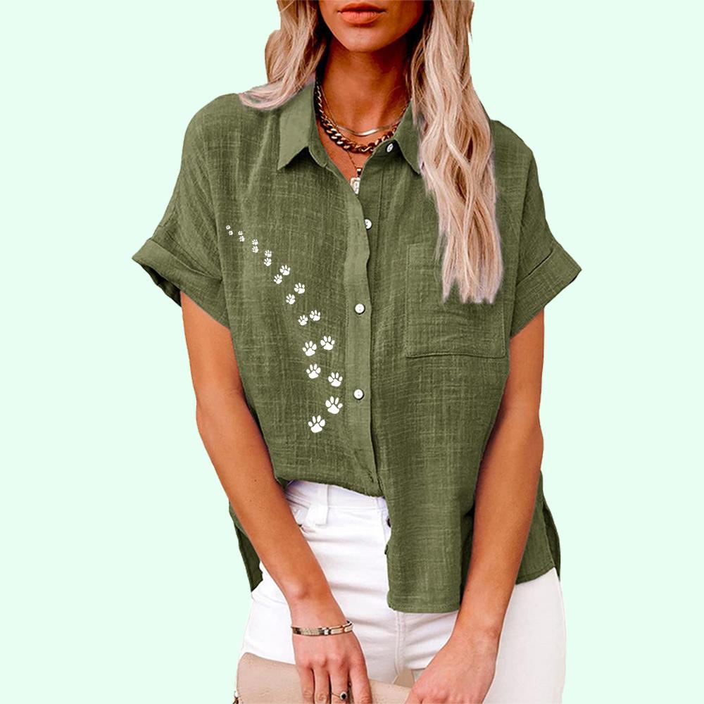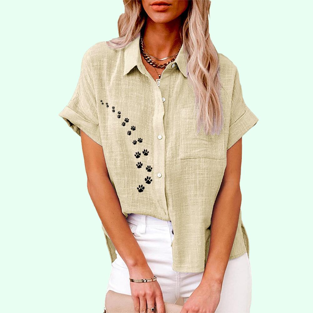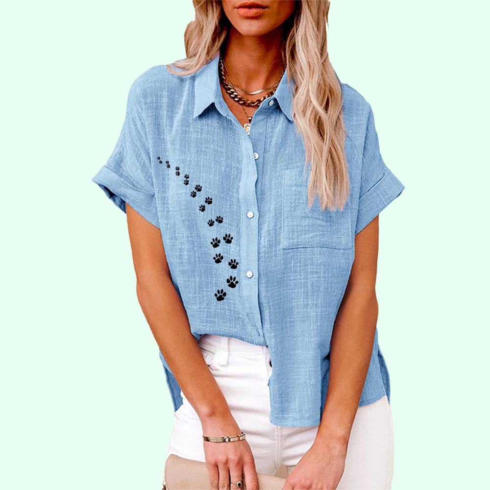 Плюс размер Женская повседневная льняная блузка с коротким рукавом, лето и осень, модная блузка с принтом кота, женская свободная футболка на пуговицах
