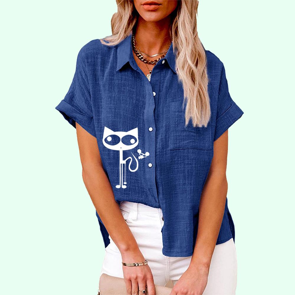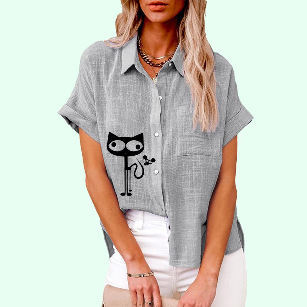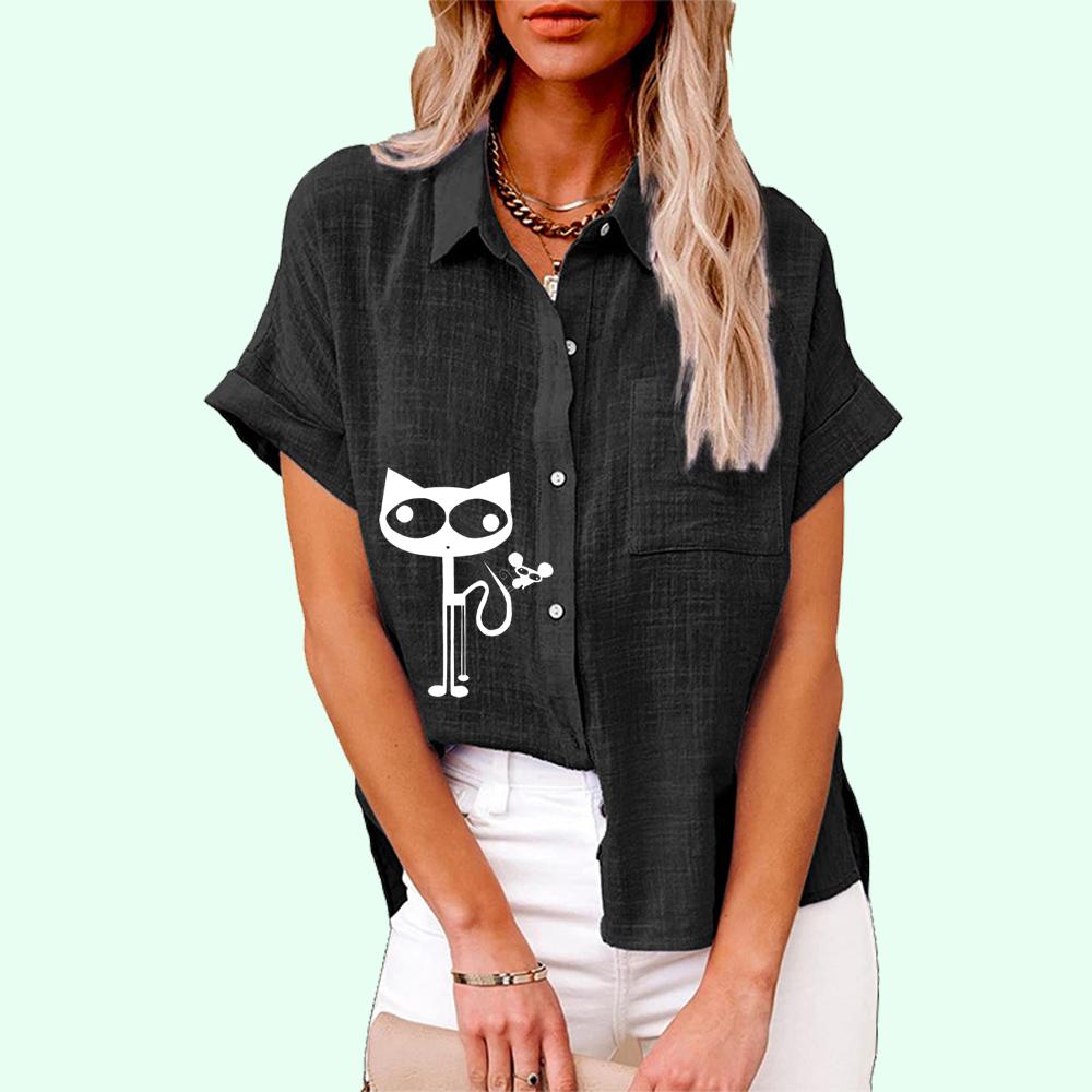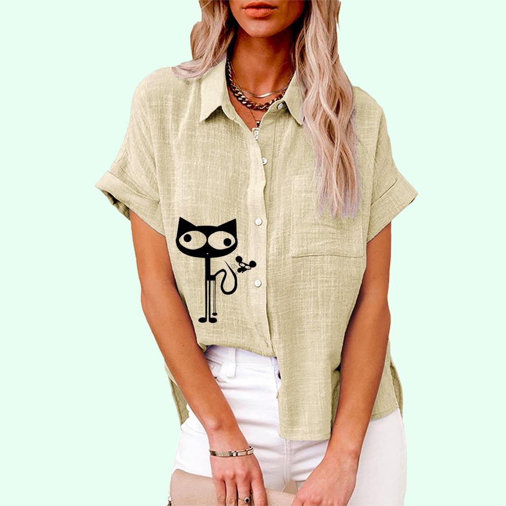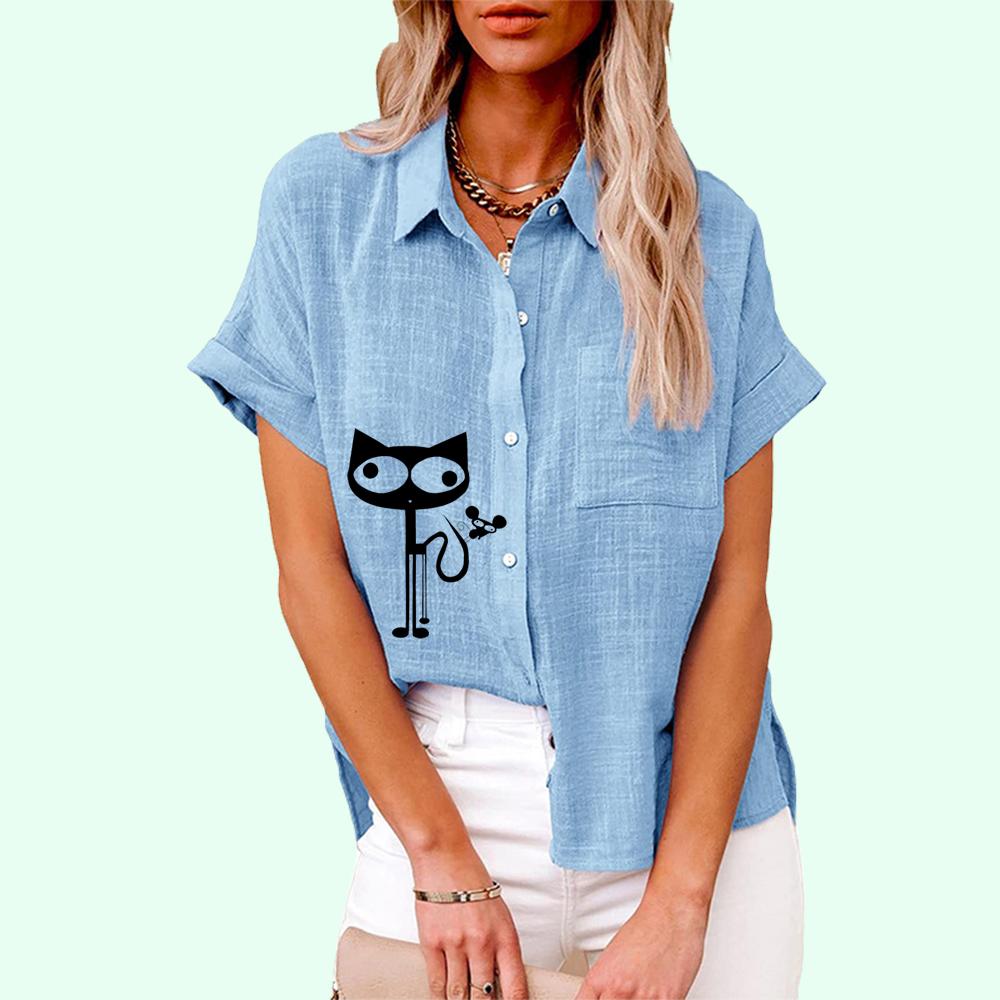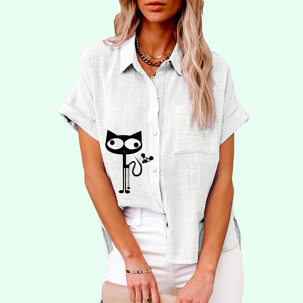 Плюс размер Женская повседневная льняная футболка с коротким рукавом и принтом кота, женская свободная блузка на пуговицах