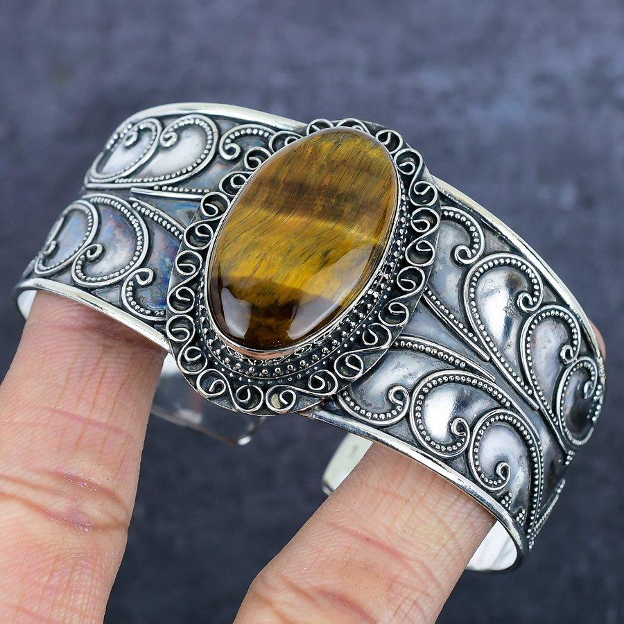 Тигровый глаз Камень Ручная работа 925 стерлинговое серебро Браслет-манжета Регулируемый Q0V16