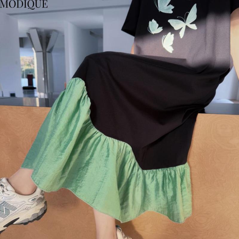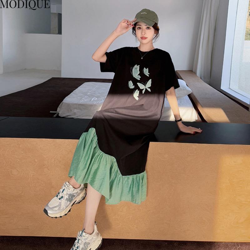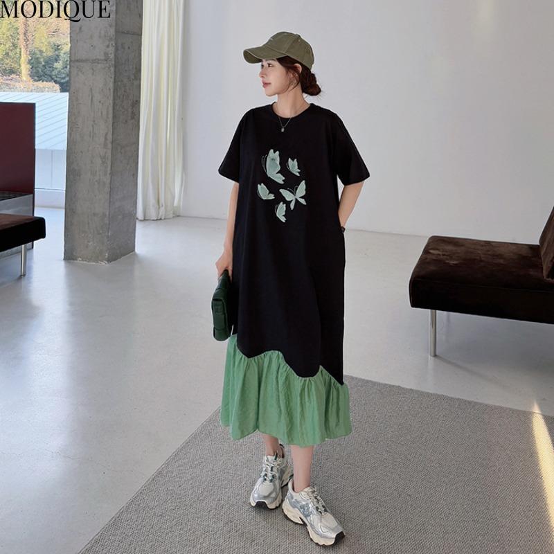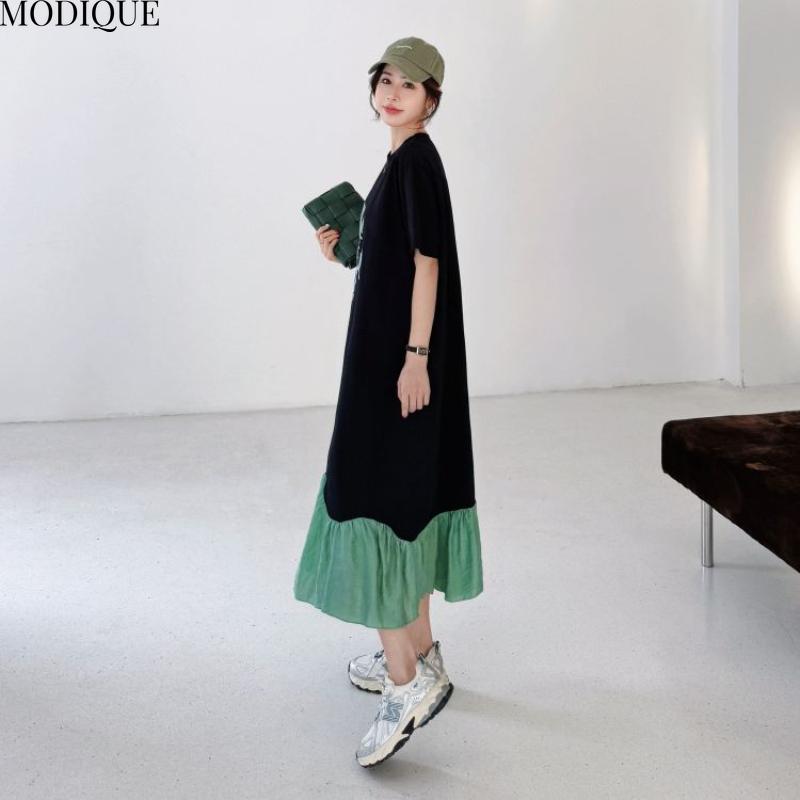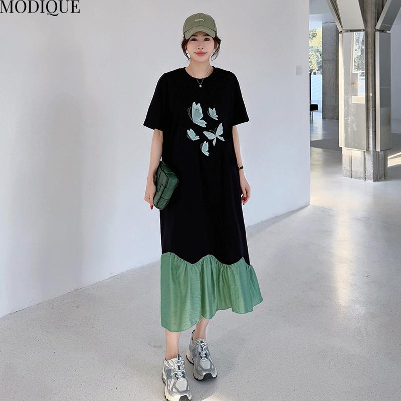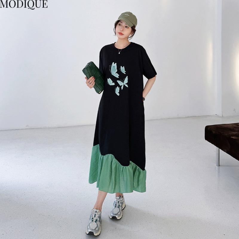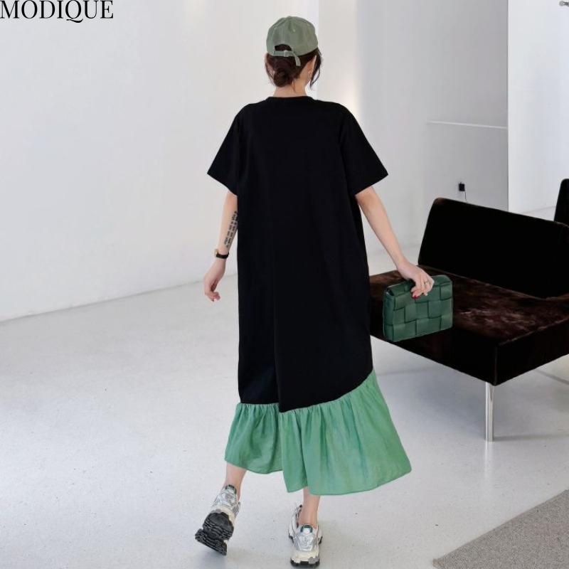 MODIQUE Лето Плюс Размер Новое Женское Свободное Плиссированное Лоскутное Длинное Платье Женское Повседневное Короткое Рукавное Платье с О-Образным Вырезом