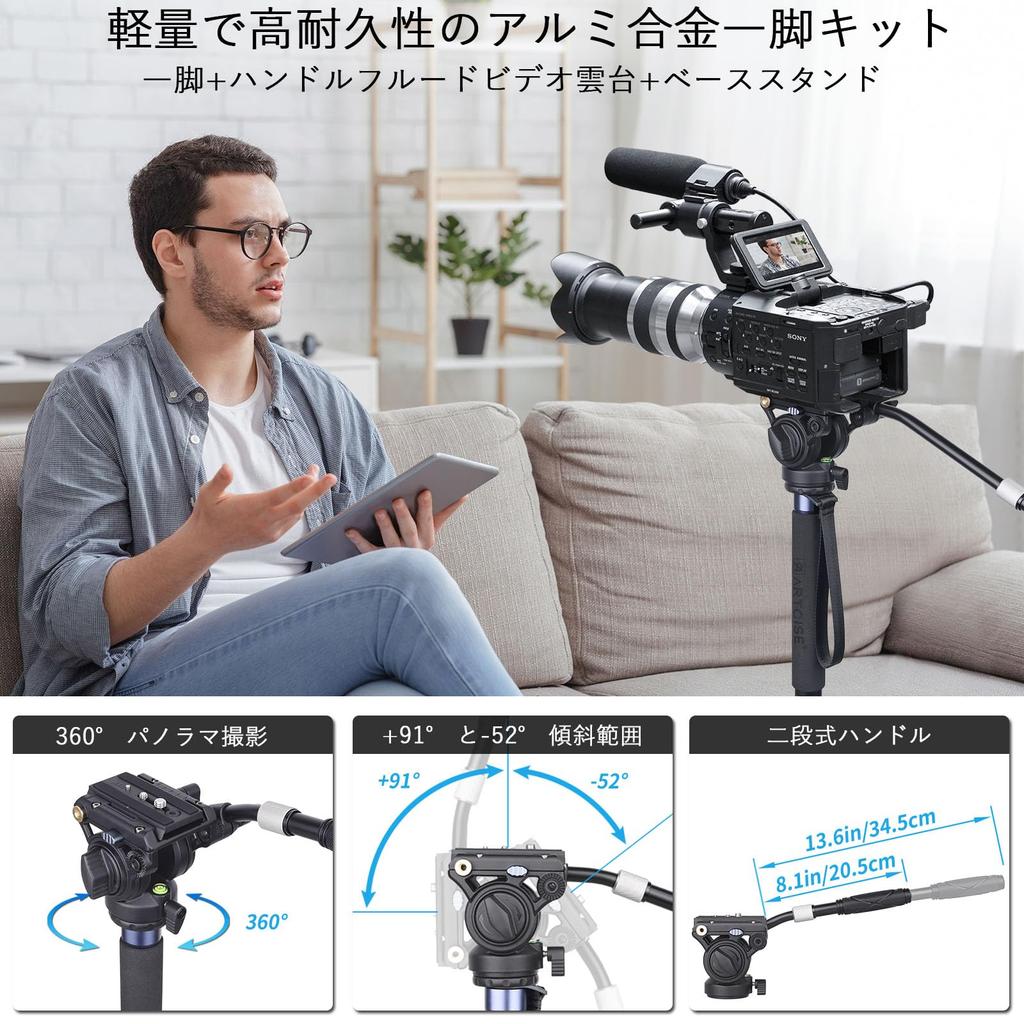 Комплект монопода из алюминиевого сплава ARTCISE с жидкостной видеоголовкой и 183 см ручкой для видеоголовки с креплением под штатив, плавным панорамированием и наклоном для видеосъемки на открытом воздухе с максимальной нагрузкой
