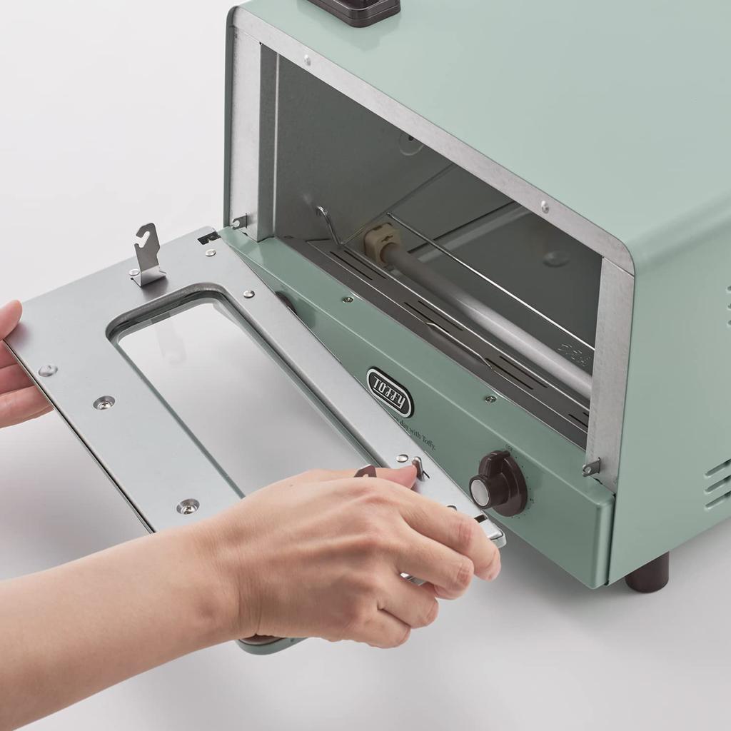 ●Съемная дверца облегчает чистку! Дверцу, решетку и поддон для панировочных сухарей, на которых часто скапливаются пятна от панировочных сухарей и масла, можно легко снять и вымыть водой.. Съемная дверца и решетка облегчают чистку внутренней части духовки, позволяя использовать ее в чистоте каждый день.