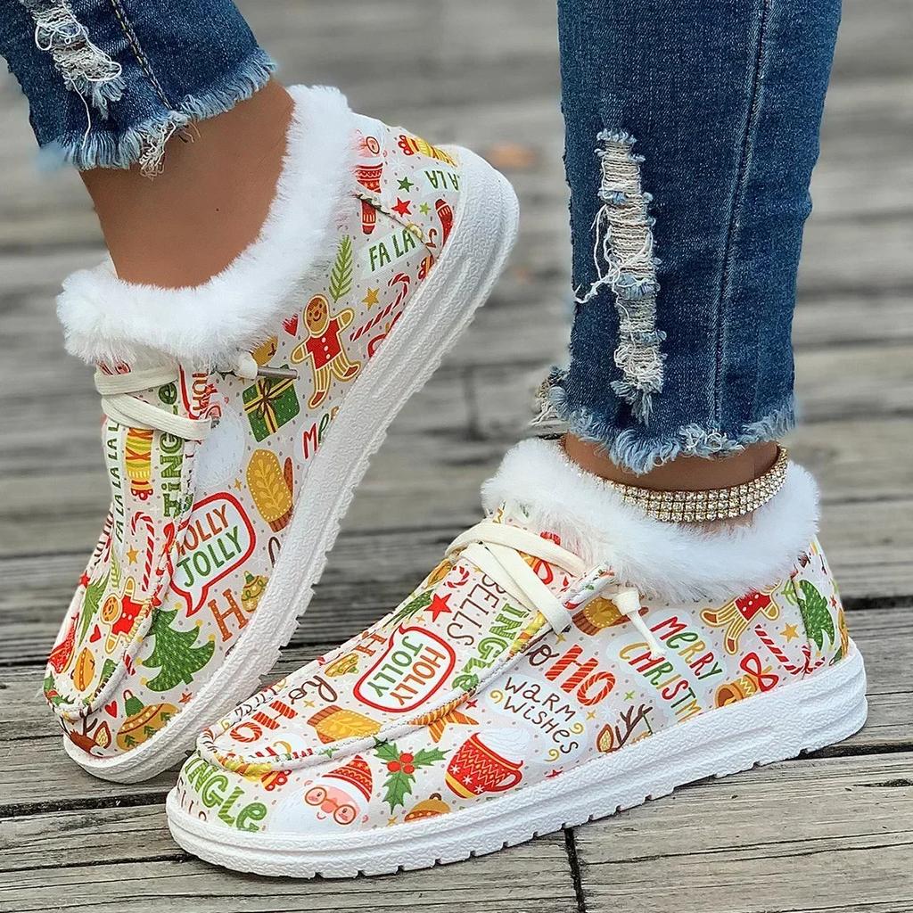 Женская повседневная обувь на плоской подошве, женские новые зимние ботильоны, женские хлопковые туфли с рождественским принтом, короткие плюшевые ботильоны, теплый подарок