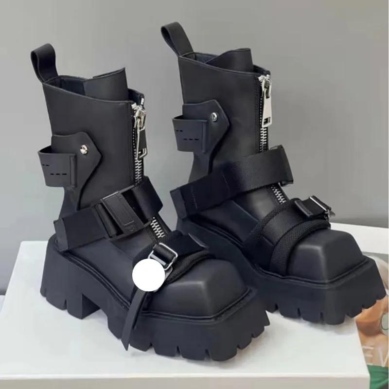 2024 Европейский стиль квадратный носок толстый каблук мотоциклетные ботинки женские кожаные молния спереди короткий ремень пряжка модные ботинки челси — купить товар онлайн с бесплатной доставкой по всему миру!