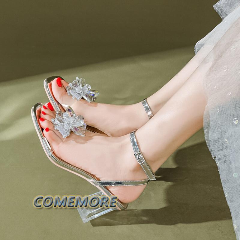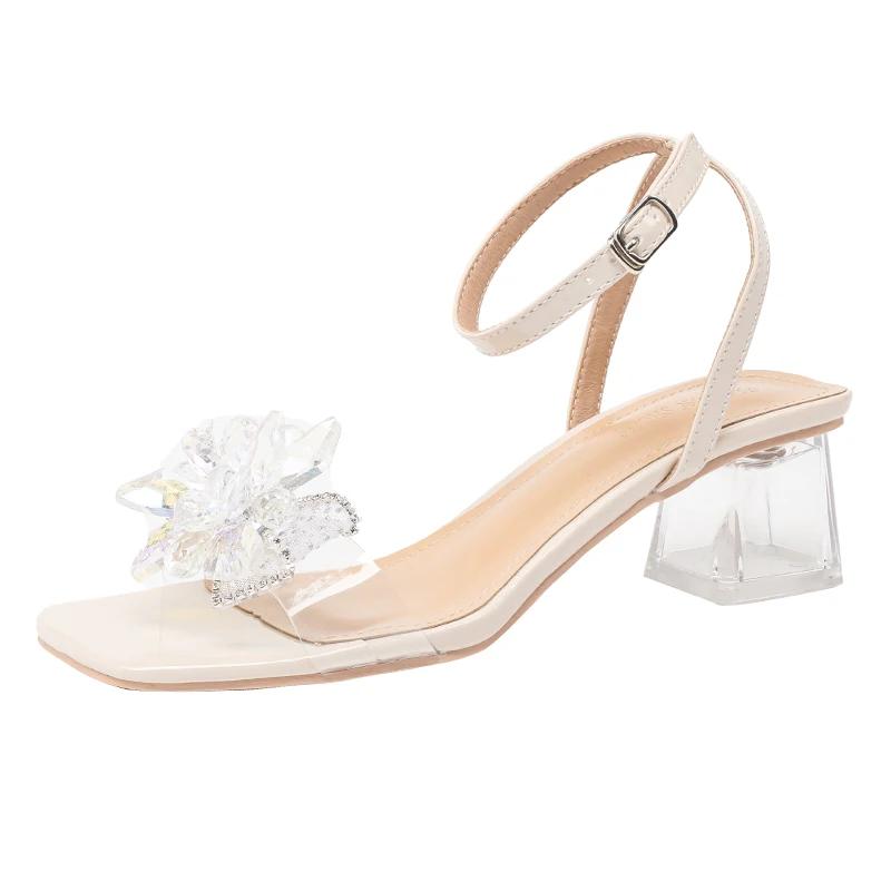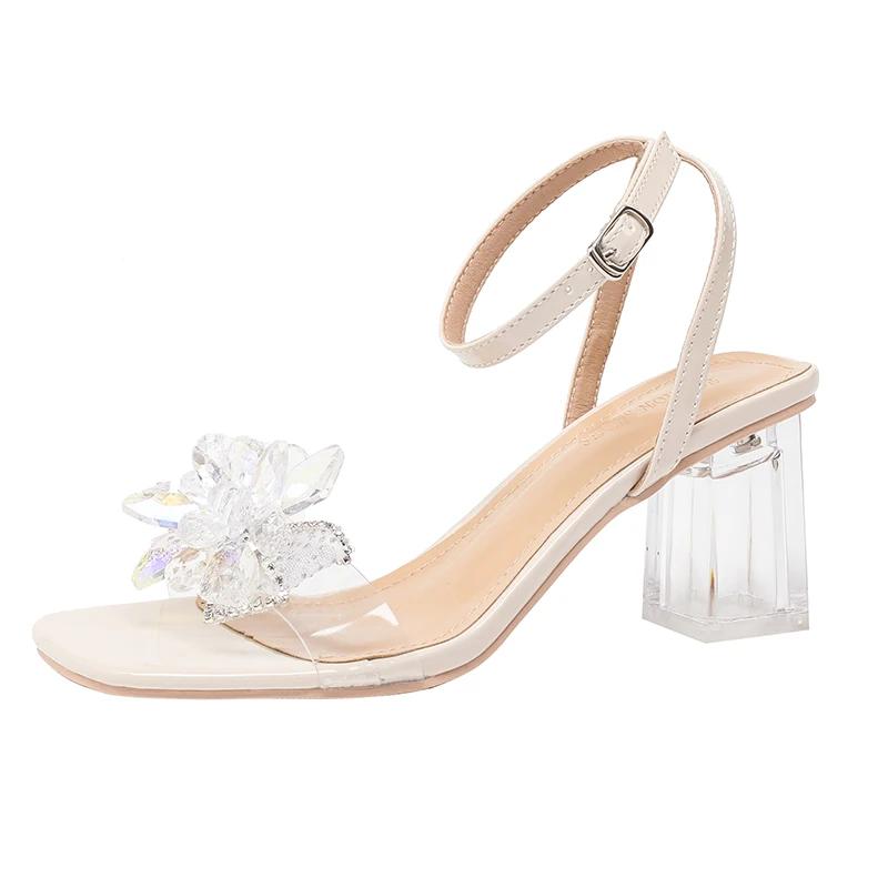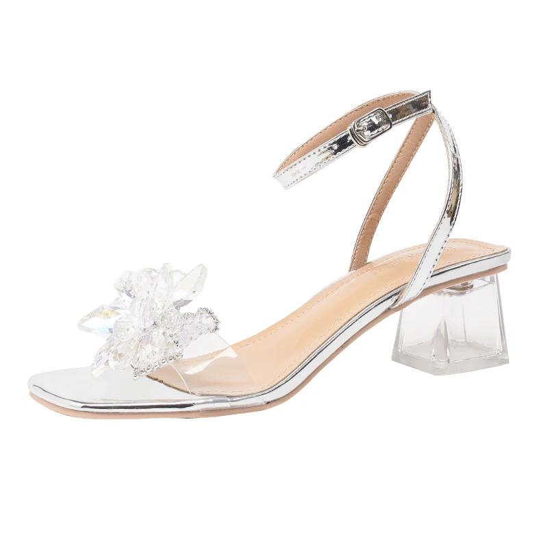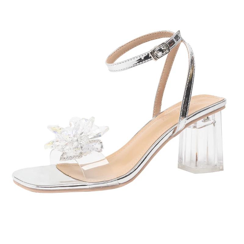Женская обувь 2024 года, горячая распродажа, босоножки с пряжкой на ремешке, модное платье с кристаллами и цветочным принтом, женские дизайнерские прозрачные босоножки на каблуке с открытым носком