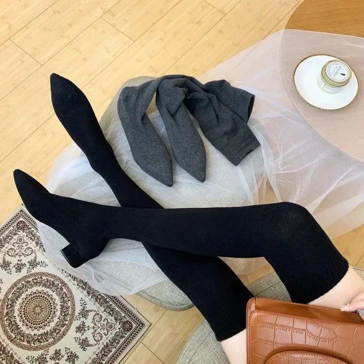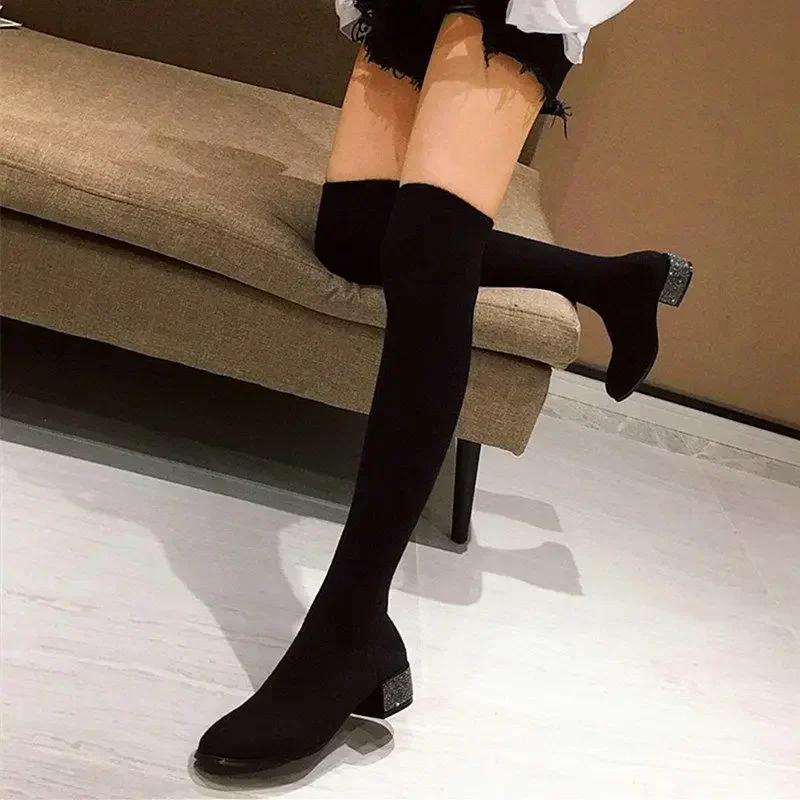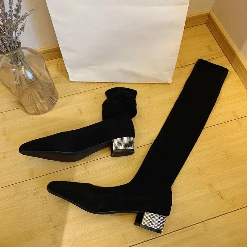 2024 Женские сапоги выше колена с острым носком, каблук со стразами, вязаные сапоги-носки, эластичные, тонкие, женские, высокие сапоги на плоской подошве