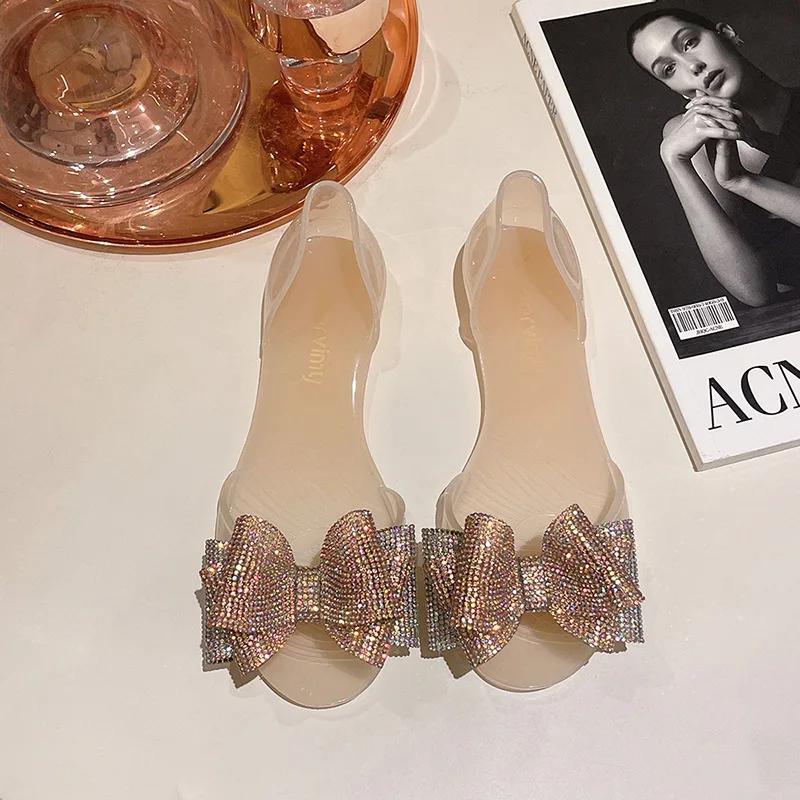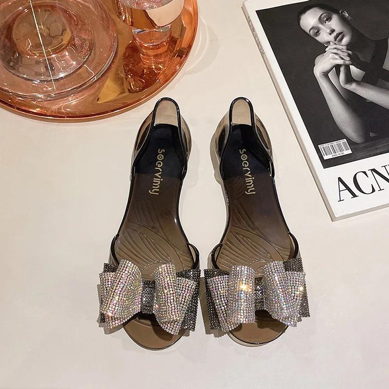 Прозрачные желейные туфли женские летние туфли на плоской подошве с бантом из пластика с открытым носком повседневные туфли без застежек 2024 весна новые женские туфли на плоской подошве