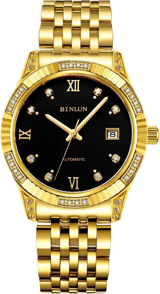 BINLUN Механические Автоматические Ручные Дата Роскошные Сапфировые Устойчивые к Царапинам Мужские Часы, (с намоткой), Золото, Бриллиант, Дисплей, Часы, Простой, Стильный,