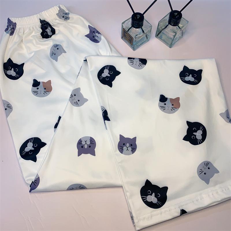 Женские свободные пижамные штаны с мультяшным котом на весну и осень — удобные, воздушные, подходят для дома и улицы.