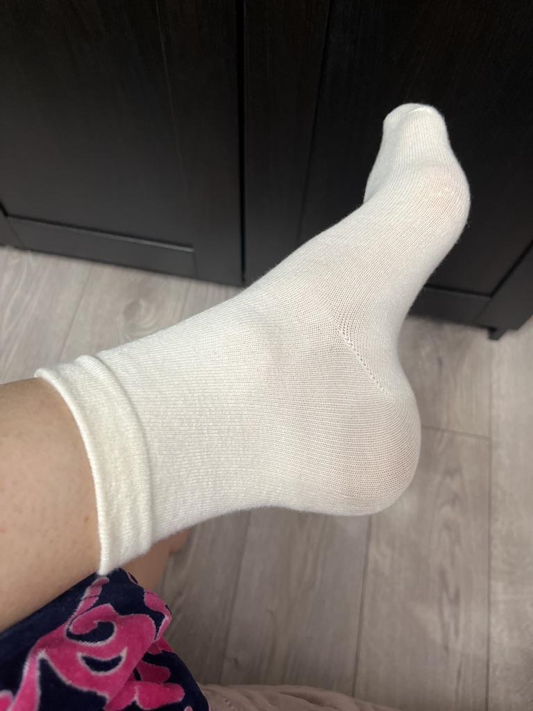 Носочки очень хорошенькие, тонкие, резинка высокая, на ноге сидит плотно, но не давит. Длина моей стопы 23,5 см, сели отлично, подойдут и на размер больше. Дополняю. Вчера надевала носочки в сапоги. Проходила в них буквально пару часов. Ноге было очень комфортно, резинка не давила и не сползла, хотя обычно такая высокая резинка сползает, ткань не окрасила ноги, но на пятках образовались катышки, много катышек, будто я их ношу уже давно.