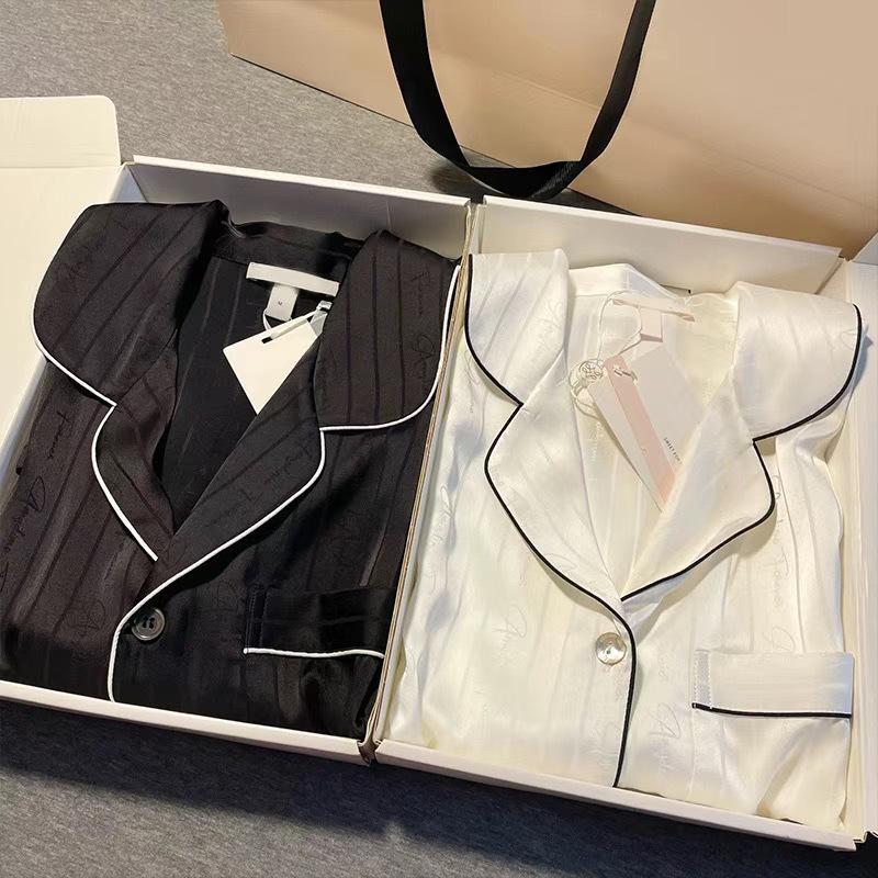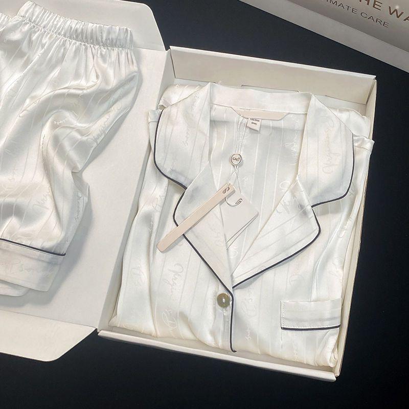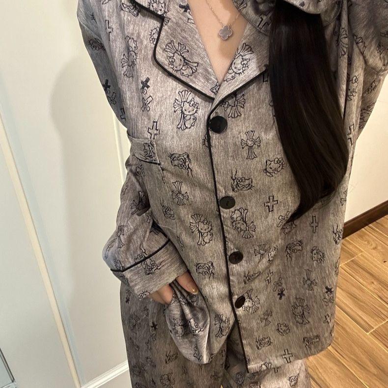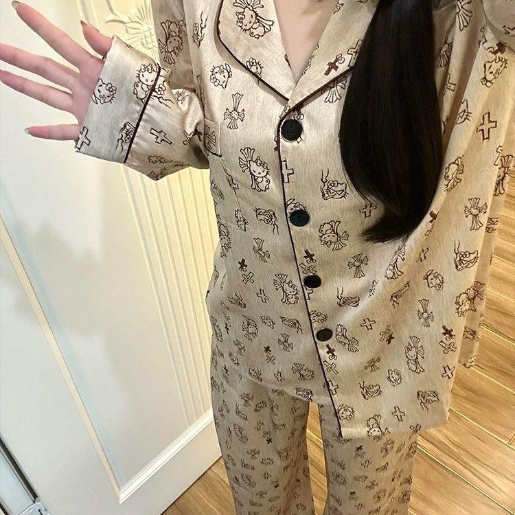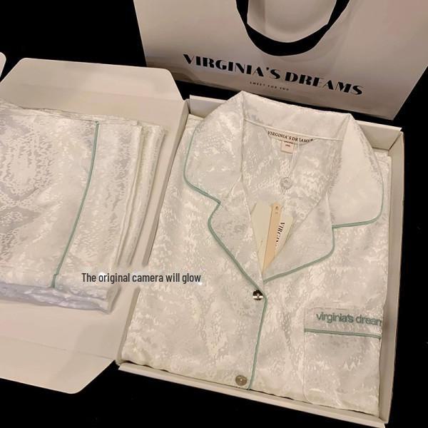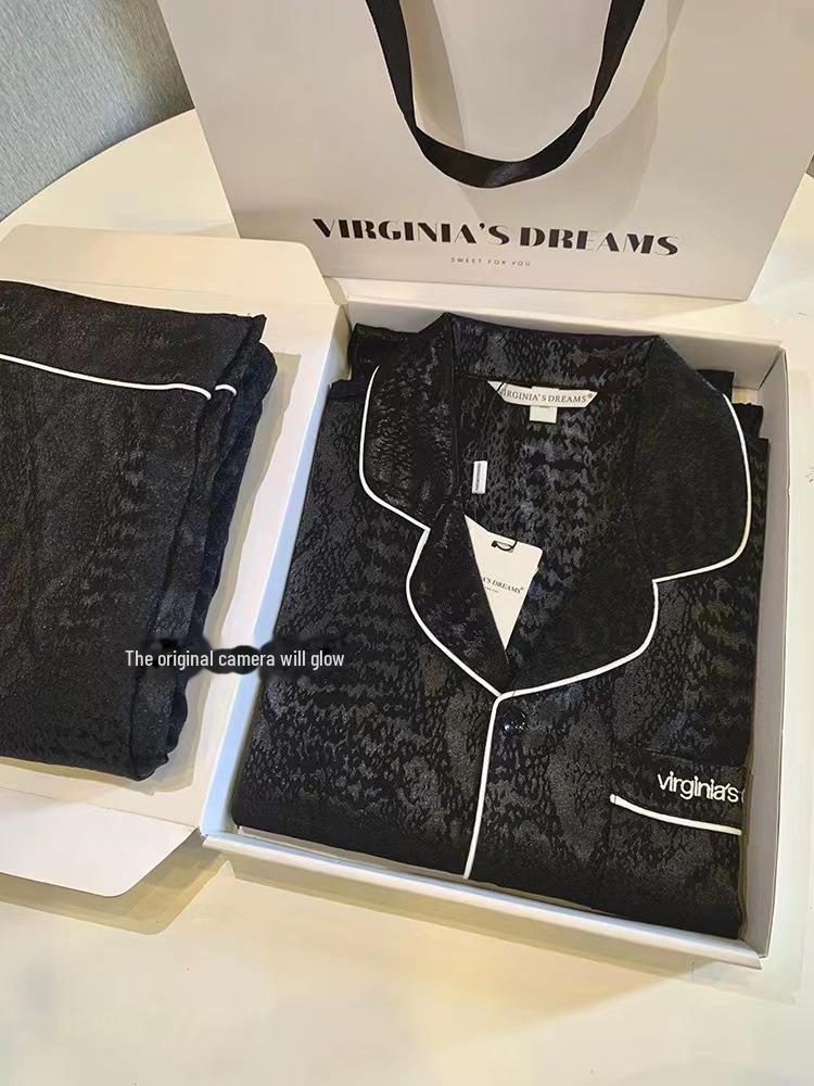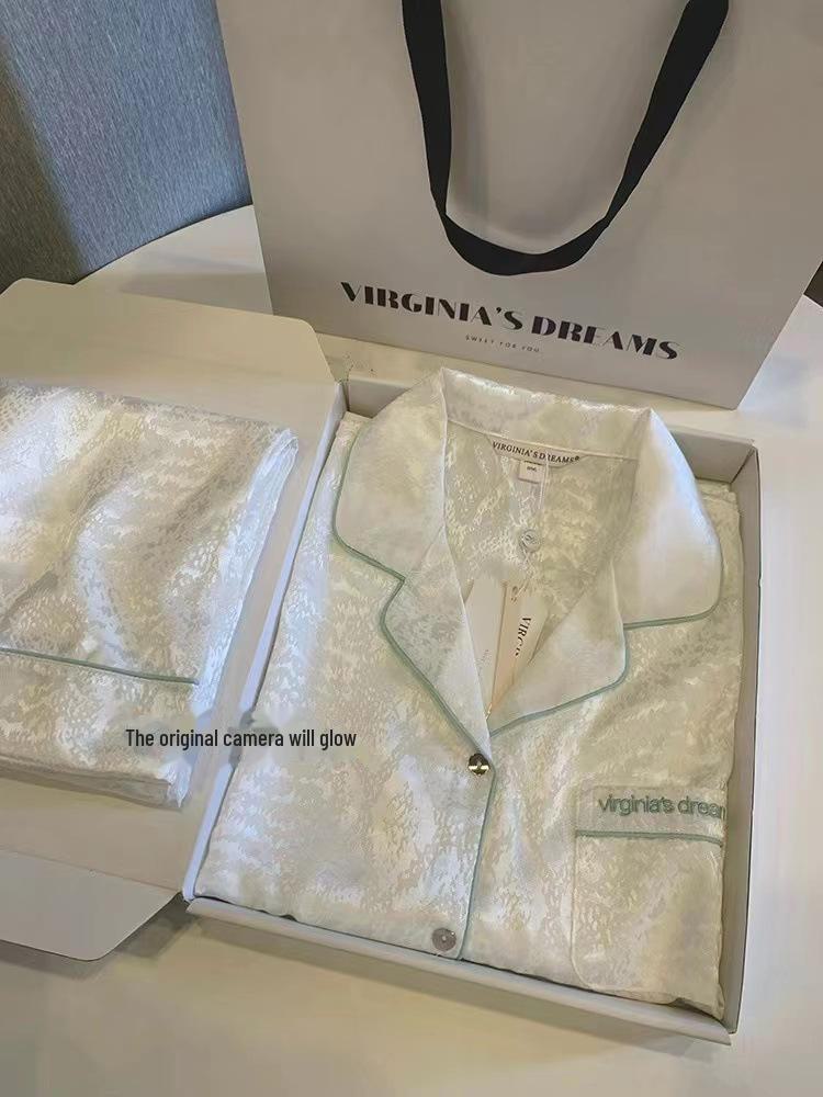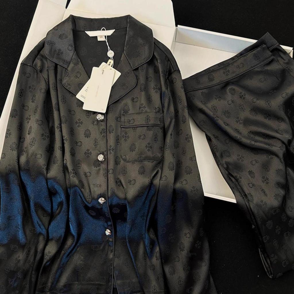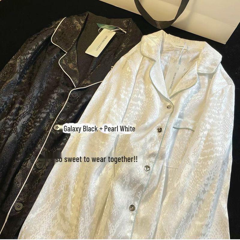 «Роскошный пижамный комплект для пары из ледяного шелка на весну — топ с длинными рукавами и жаккардовые брюки»