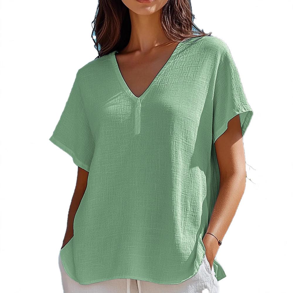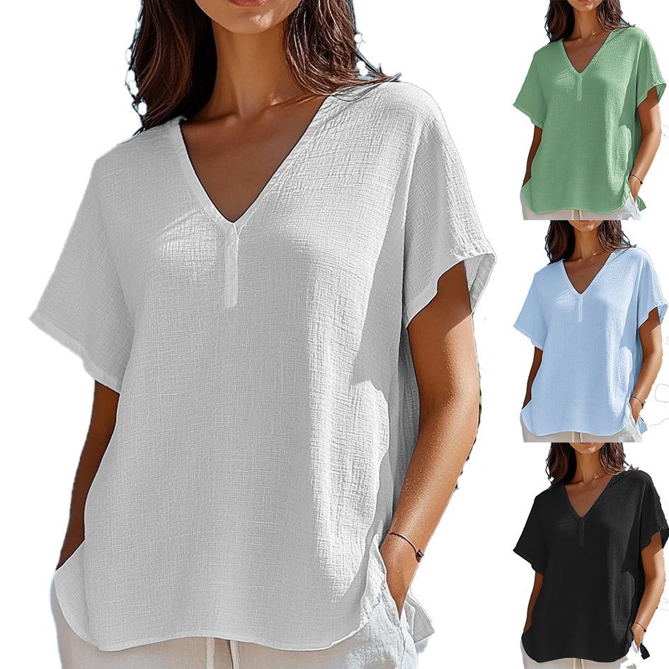 Весна и лето Новые свободные однотонные топы с V-образным вырезом и короткими рукавами женские блузки и рубашки