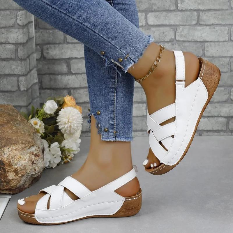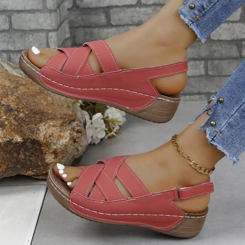 Женские босоножки на танкетке контрастного цвета с открытым носком и перекрестными ремешками, дышащие и удобные для летнего отдыха на свежем воздухе