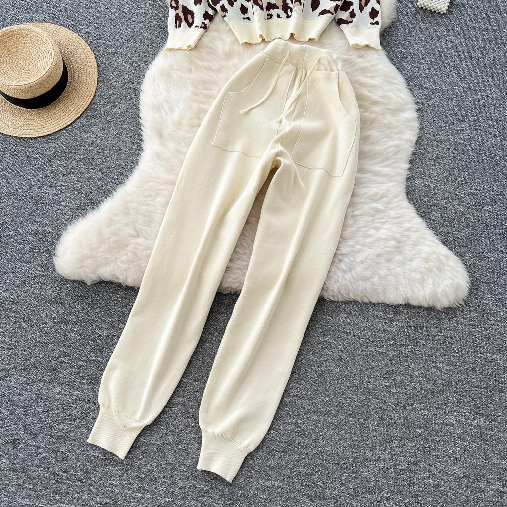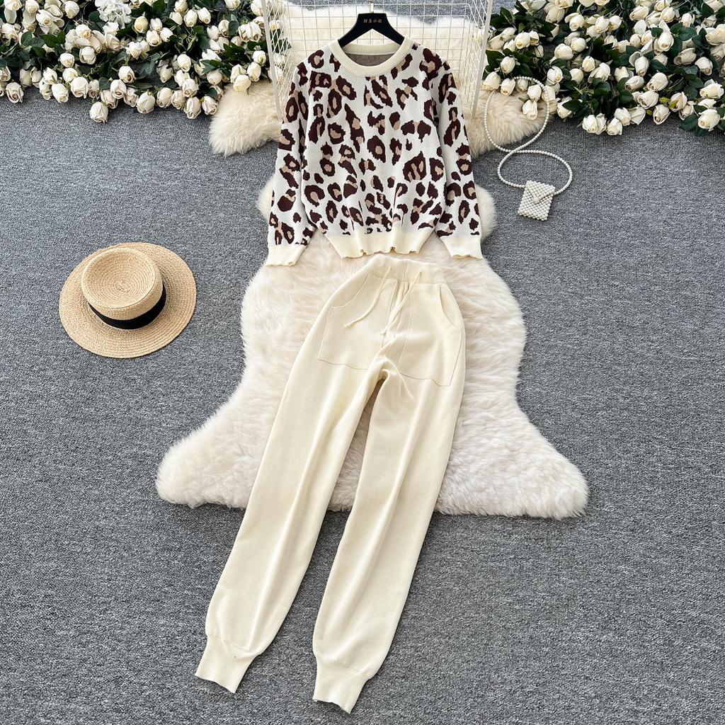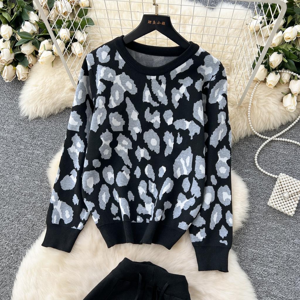 Осенне-зимний женский трикотажный свитер с принтом, брюки, комплект из двух предметов, женский свитер с круглым вырезом и спортивный костюм с брюками длиной до щиколотки