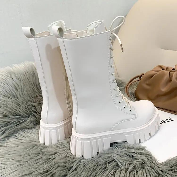 2024Женские сапоги Модные сапоги до середины голени Повседневные сапоги из искусственной кожи Ботинки на нескользящей платформе для женщин Ботильоны на шнуровке Botas Mujer