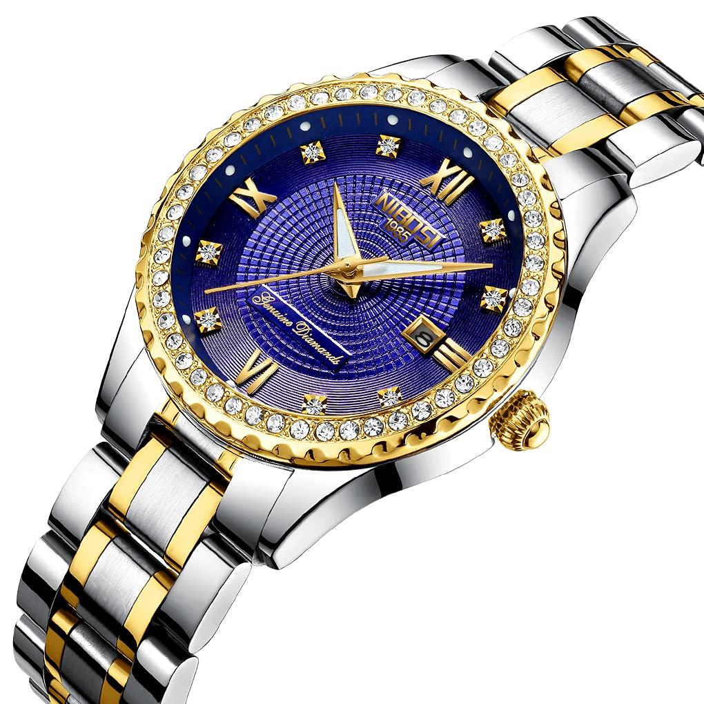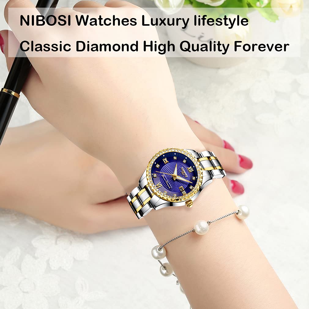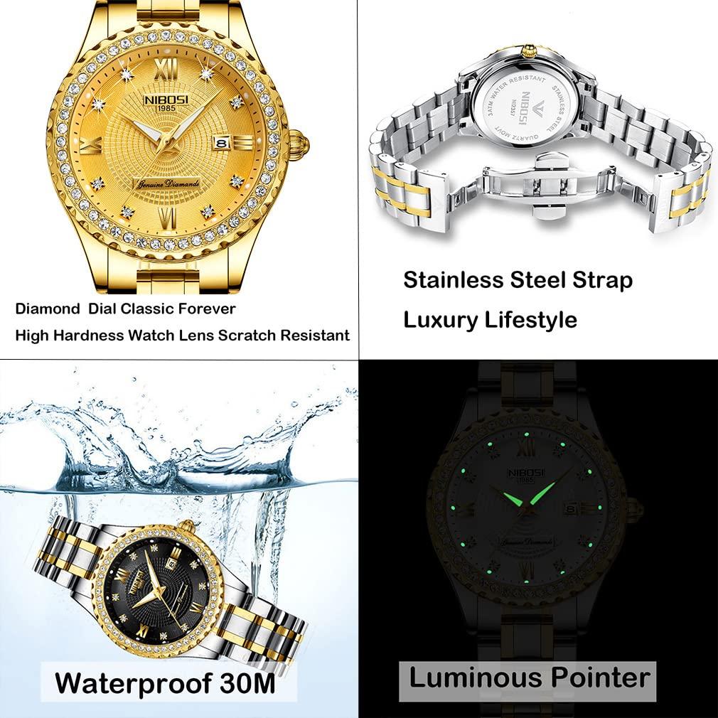 NIBOSI Часы женские классические роскошные бриллиантовые модные: Изысканно оформленный и хорошо оформленный. Элегантный дизайн циферблата и изысканное часовое мастерство обеспечат вам идеальные ощущения при ношении.. Носите эти часы для работы, отдыха, ежедневного использования в помещении и на улице, они подойдут вам и вашим друзьям.. Роскошные наручные часы доставляются Amazon быстро и точно по адресу, указанному клиентом.. Женские часы Business Стильные флуоресцентные высокого качества: Импортный японский кварцевый механизм обеспечивает точность времени, аналоговый дисплей и простая функция циферблата делают эти часы идеальным подарком или личным аксессуаром на любой случай.. Водонепроницаемые женские часы из нержавеющей стали золотого и серебряного цвета с высококачественным антибликовым покрытием на циферблате, предотвращающим появление царапин и поломок.. Женские кварцевые аналоговые часы, модные повседневные часы из нержавеющей стали с окошком циферблата с днем и датой, круглые часы со светящейся стрелкой, водонепроницаемые до 30 м, для мытья рук, плавания, ежедневного использования, водонепроницаемые, под водой