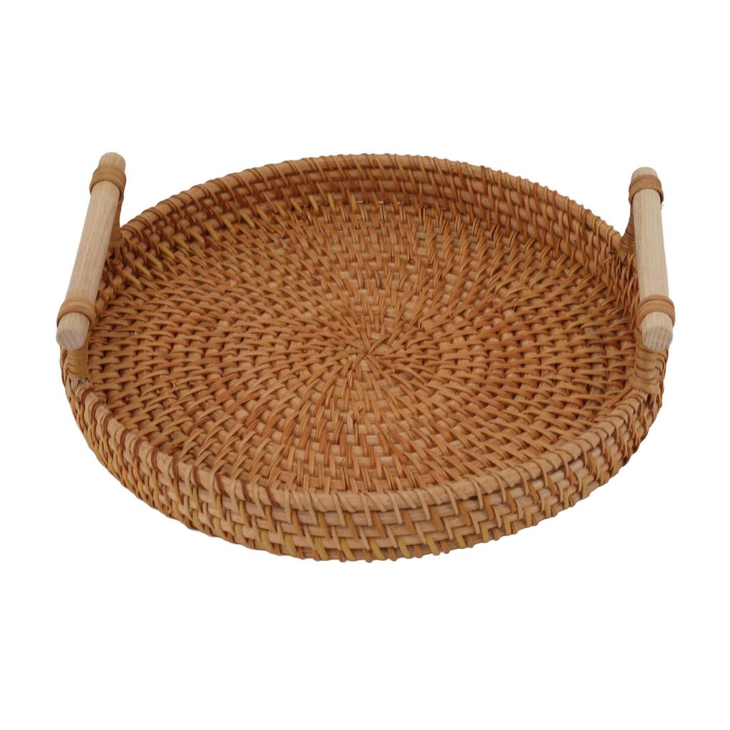 Поднос для фруктов из ротанга с ручками из цельного дерева. Изысканный круглый сервировочный поднос ручной работы для хранения.