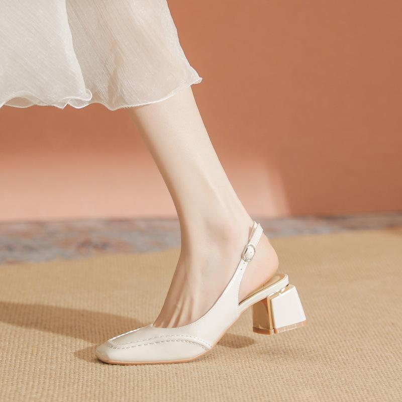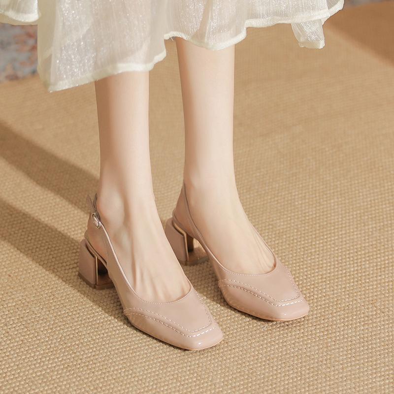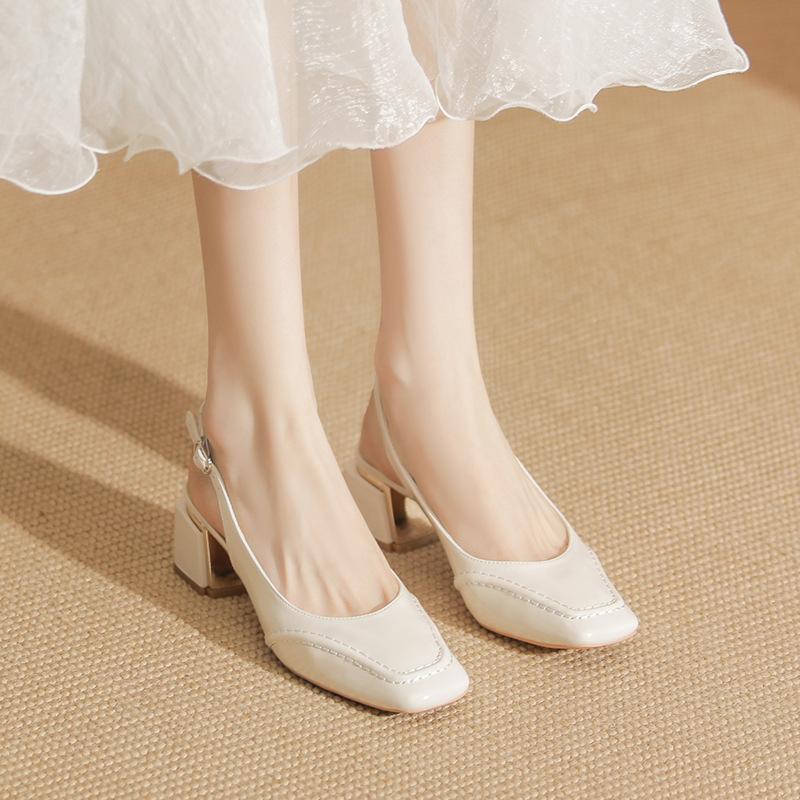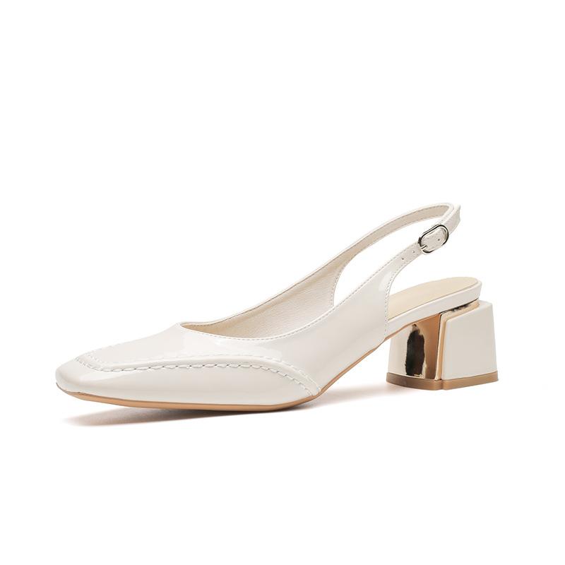 Сандалии телесного цвета женские лакированные кожаные толстые каблуки сумка головка летние новые высокие каблуки маленькие квадратные головки белые одинарные туфли