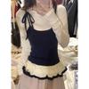 Корейские женские футболки Fake Two Chic Tees Длинные рукава О-образный вырез Оборки Милые майки Бандаж Повседневные футболки Y2k