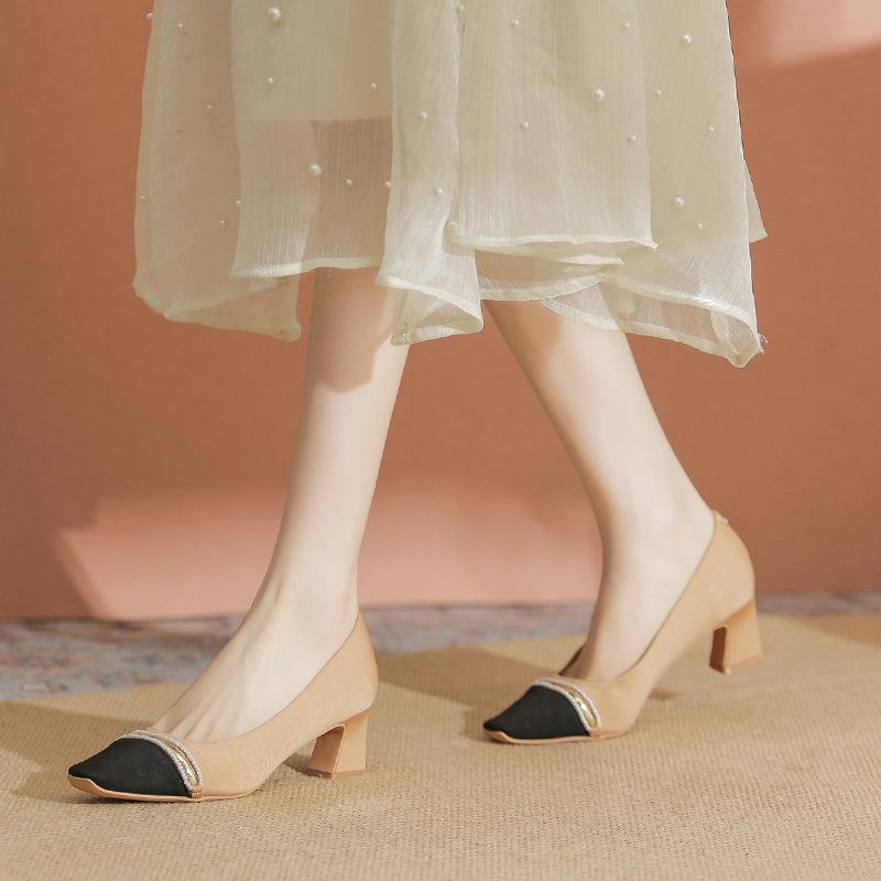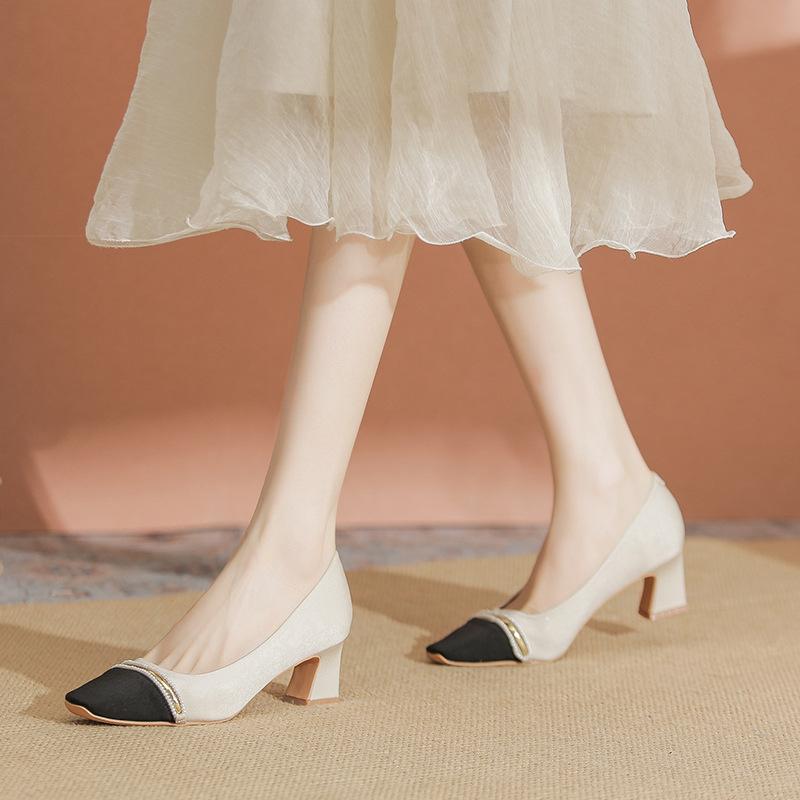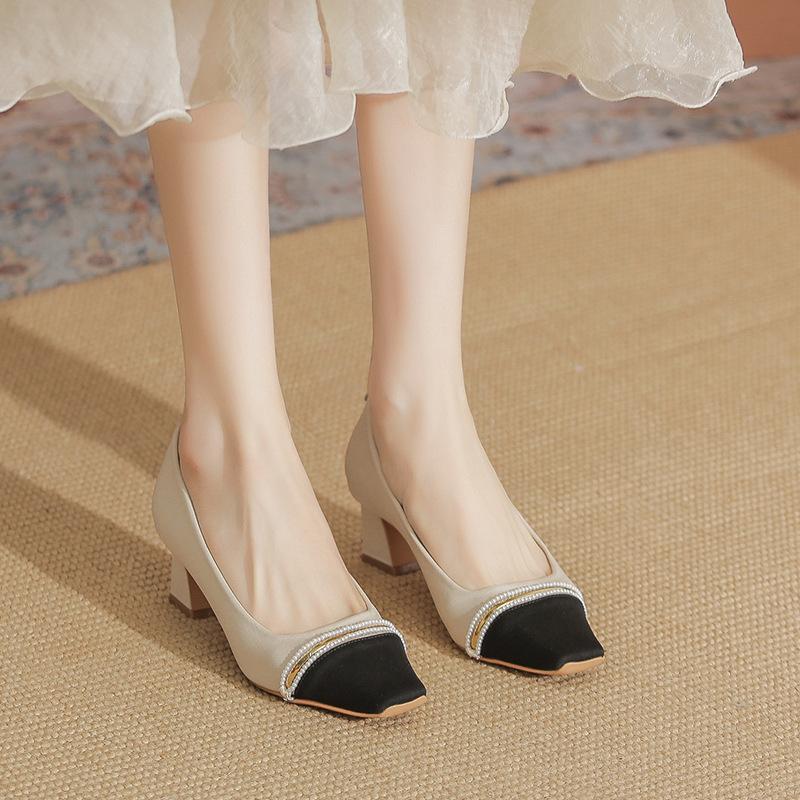 Туфли-лодочки с квадратной головкой и жемчужным узором, соответствующие цвету, на толстом каблуке, женские, весенние, новые, универсальные, на высоком каблуке