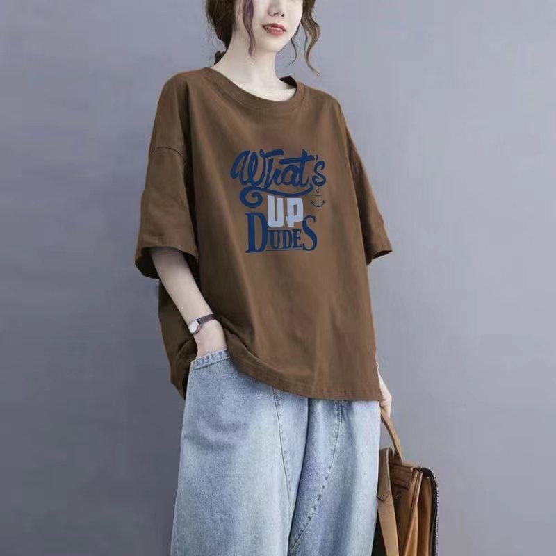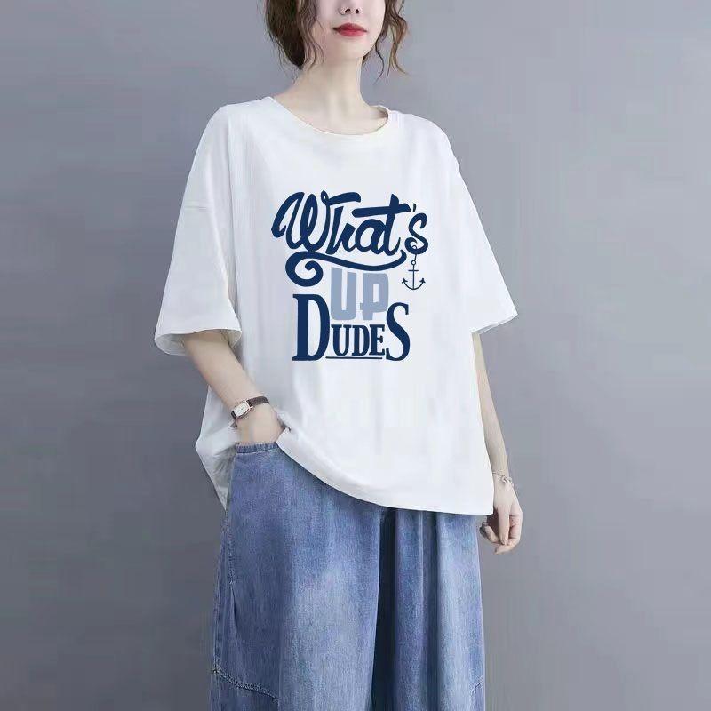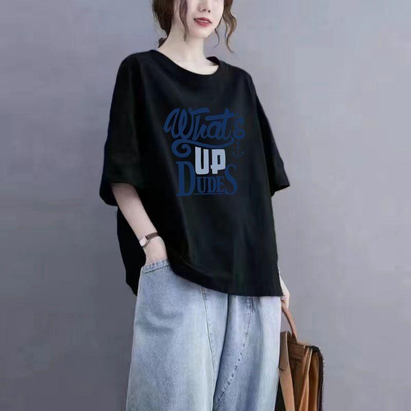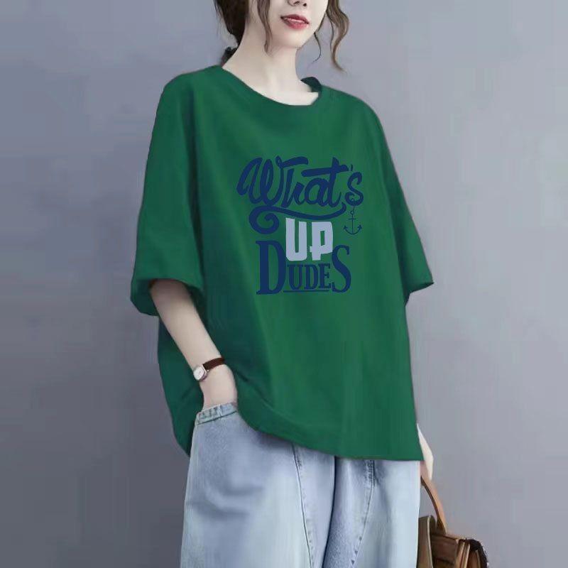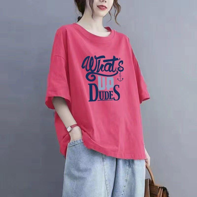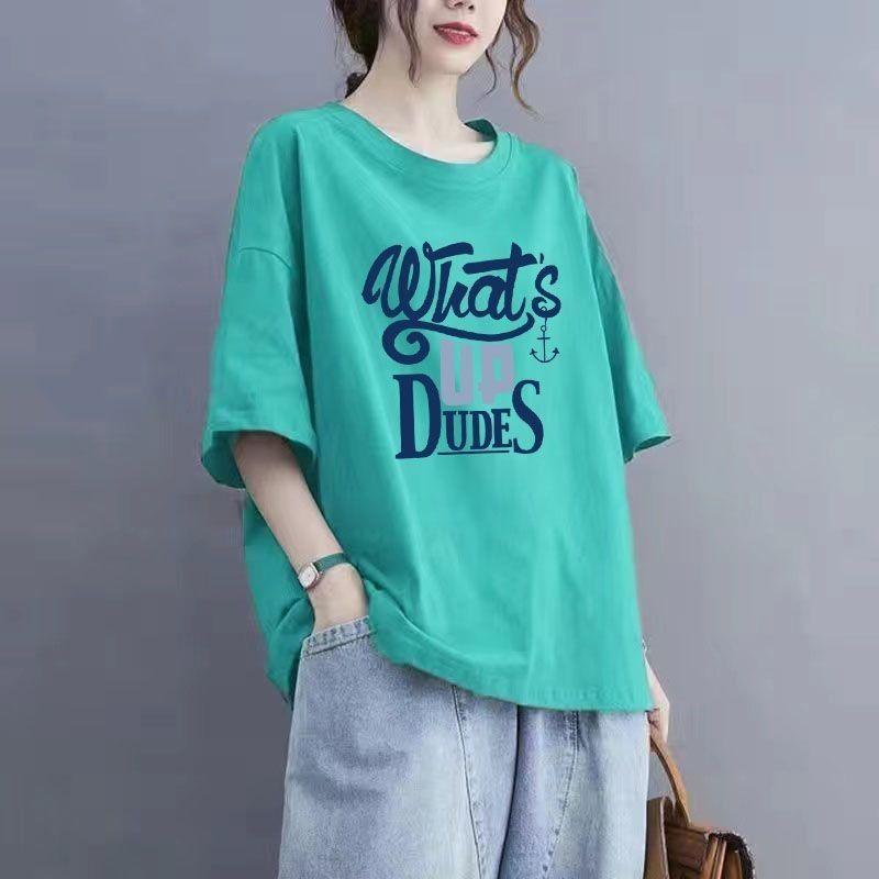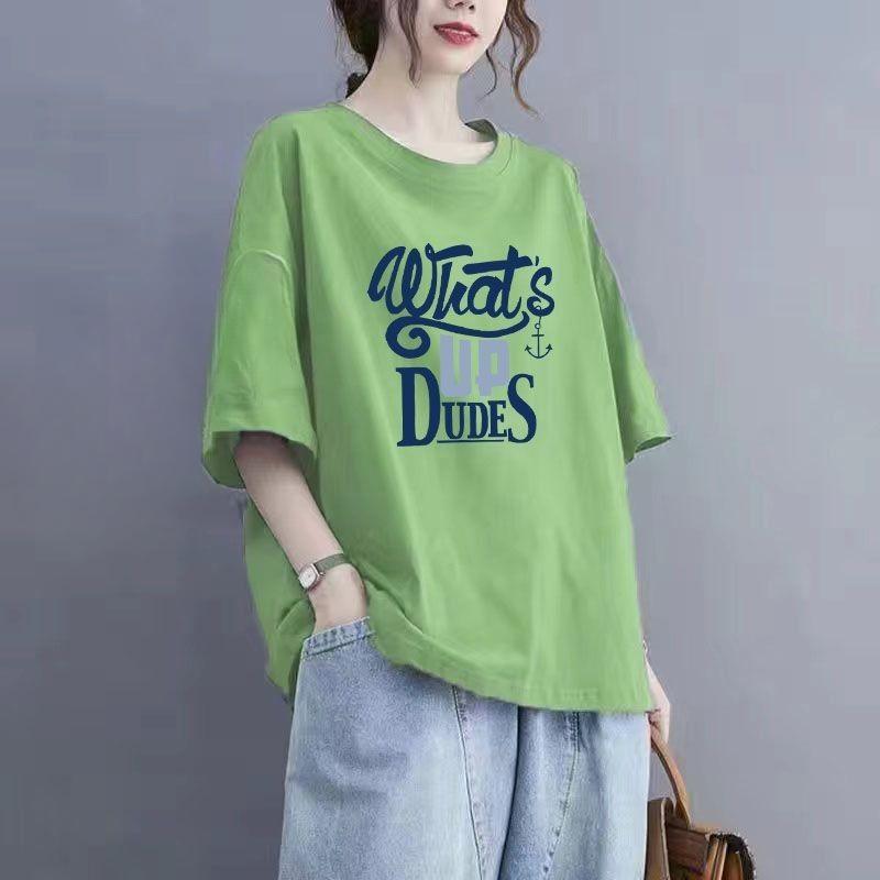 Летняя хлопковая футболка с короткими рукавами и принтом, женская футболка большого размера с круглым вырезом, летний топ