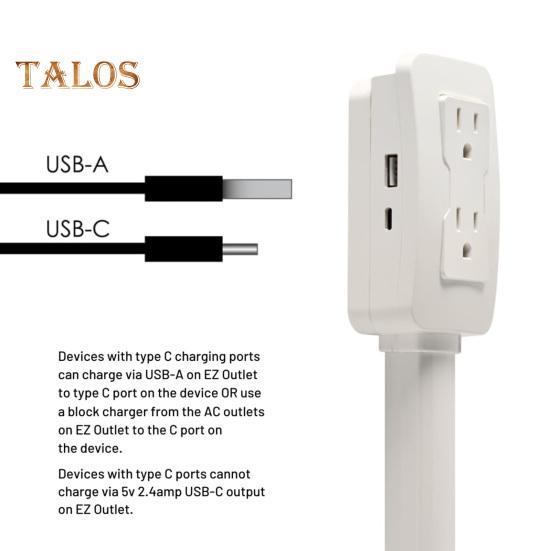 Универсальный зарядный концентратор: Этот удлинитель, оснащенный портами USB-A, USB-C и двумя розетками переменного тока, позволяет одновременно заряжать несколько устройств с помощью выходного напряжения USB 5 В 2,4 А на портах USB.