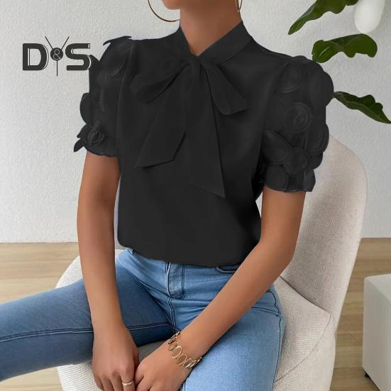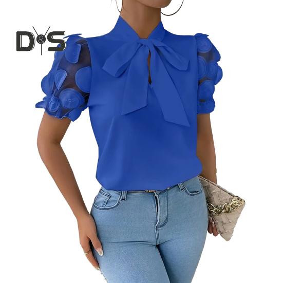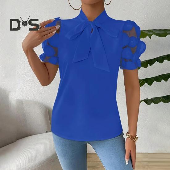 Подчеркните свой стиль с помощью этой женской рубашки с классическими узорами, которые подчеркнут вашу фигуру и придадут повседневный, но модный вид.. Рубашка имеет завязывающийся бант на шее и короткие рукава из сетчатого жаккарда, что добавляет нотку элегантности однотонному дизайну.. Изготовленная из высококачественного полиэстера, эта рубашка обеспечивает легкость, комфорт и воздухопроницаемость для ношения в течение всего дня..