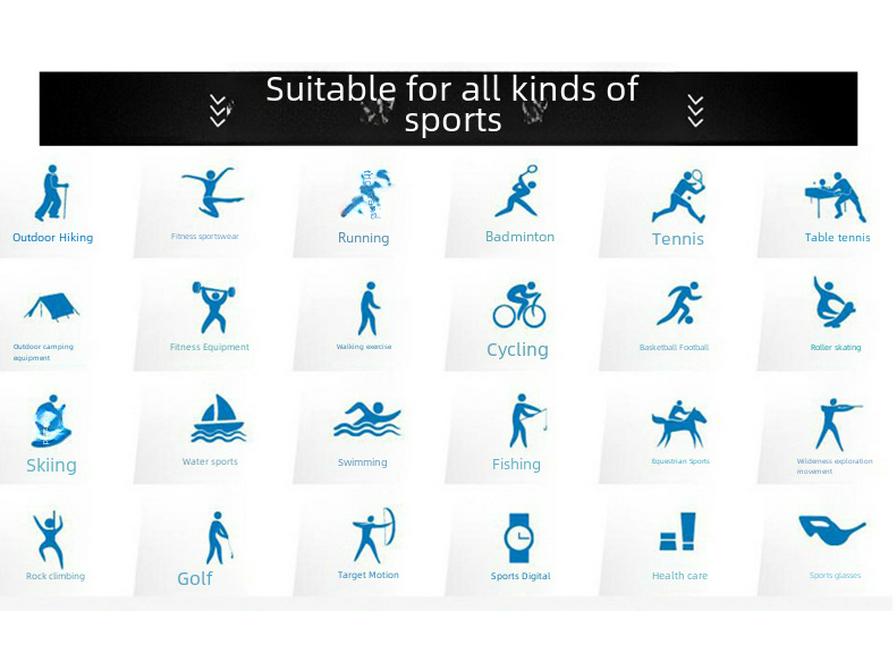 Применимая сцена: Бег, фитнес-оборудование, фитнес и бодибилдинг, спортивные тенденции, велоспорт, зимние виды спорта, экстремальные испытания, пеший туризм и кемпинг, боевые искусства, самооборона, танцевальные движения, футбол, баскетбол, волейбол, рыбалка, настольный теннис, бадминтон и теннис, другие игры с мячом, упаковка, защитное снаряжение