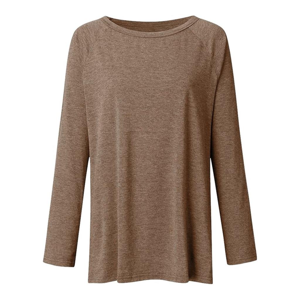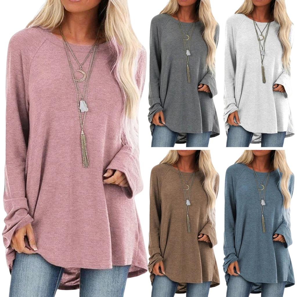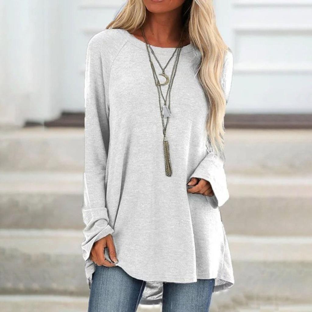 Элегантный и универсальный: Подчеркните свой стиль с помощью этой женской футболки однотонного дизайна и свободного кроя, воплощающей простоту и модный шарм.. Топ с длинными рукавами доходит до бедер, скрывая живот и бедра, создавая облегающий силуэт, который никогда не выйдет из моды.