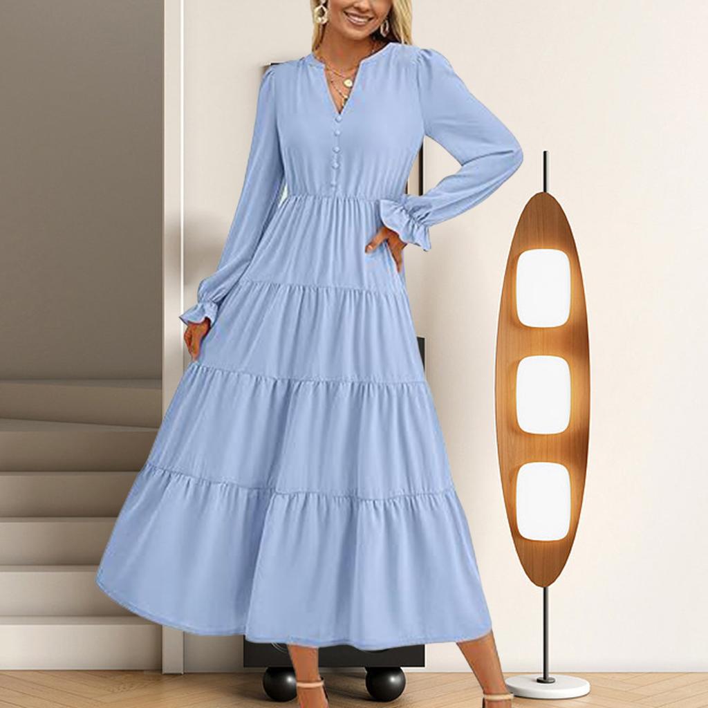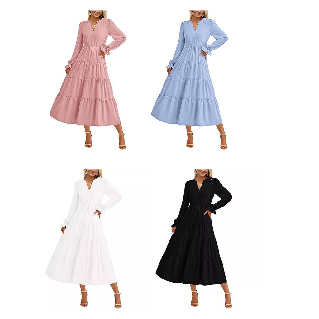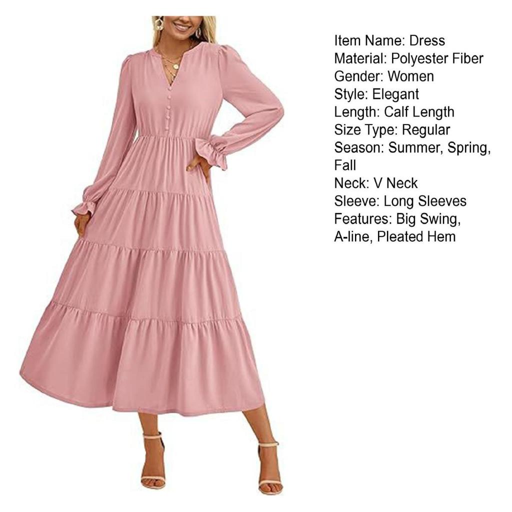 Элегантный и универсальный: Подчеркните свой стиль с помощью этого женского однотонного платья с V-образным вырезом, рукавами-фонариками и декоративными пуговицами.. Высокая талия и А-образный плиссированный ниспадающий край создают стройнящий эффект, придавая элегантность любому случаю.