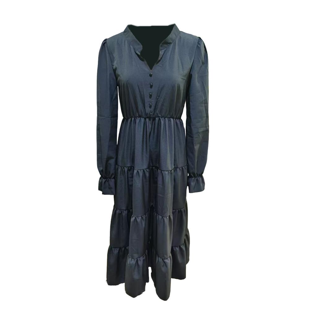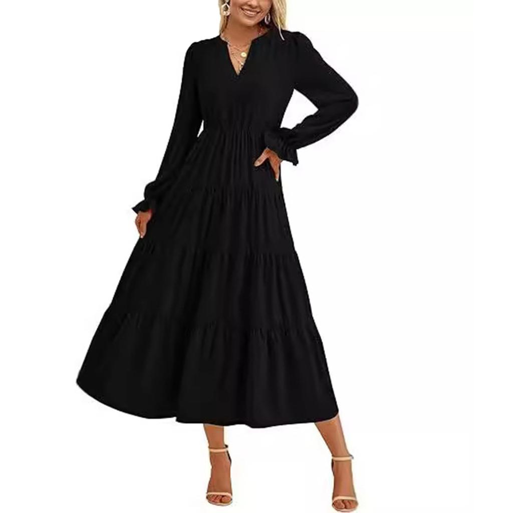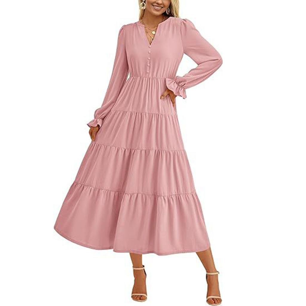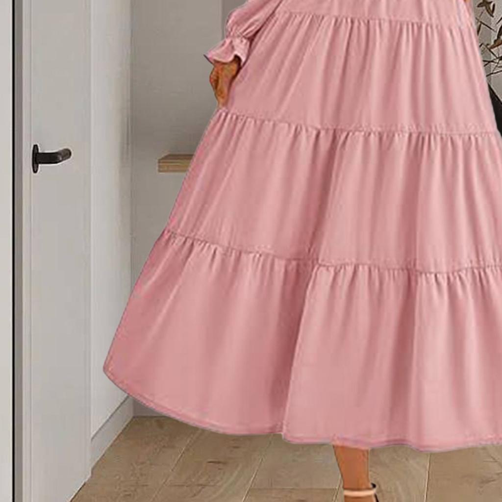 Элегантный и универсальный: Подчеркните свой стиль с помощью этого женского однотонного платья с V-образным вырезом, рукавами-фонариками и декоративными пуговицами.. Высокая талия и А-образный плиссированный ниспадающий край создают стройнящий эффект, придавая элегантность любому случаю.