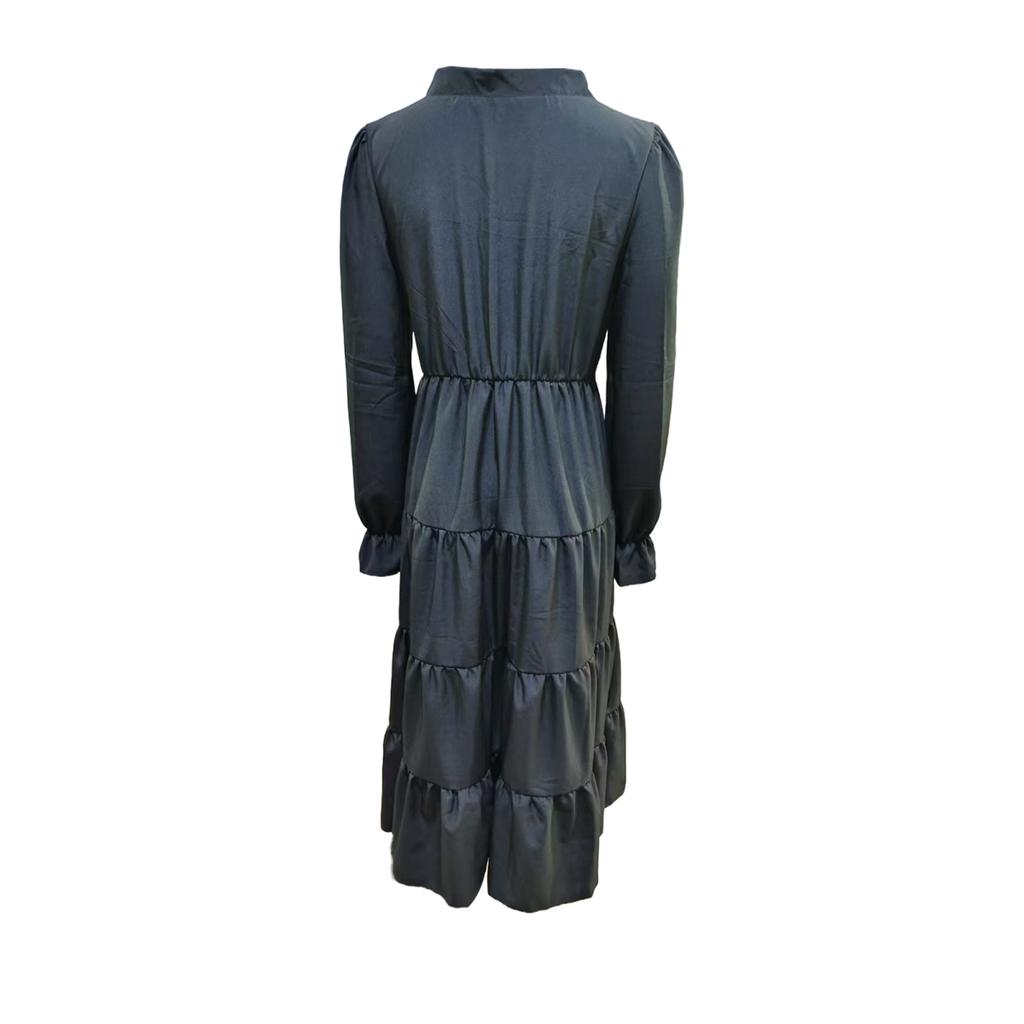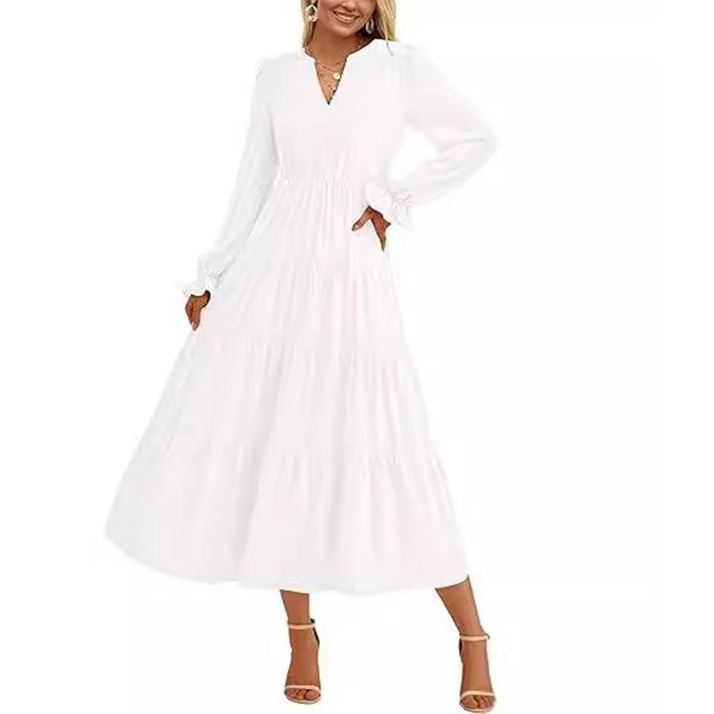 Это элегантное однотонное платье, созданное специально для женщин, излучает изысканность и стиль.. Это коктейльное платье с V-образным вырезом, рукавами-фонариками и декоративными пуговицами выглядит одновременно шикарно и модно.. Высокая талия и многослойное свободное платье создают А-образный плиссированный струящийся подол, подчеркивающий ваш силуэт..
