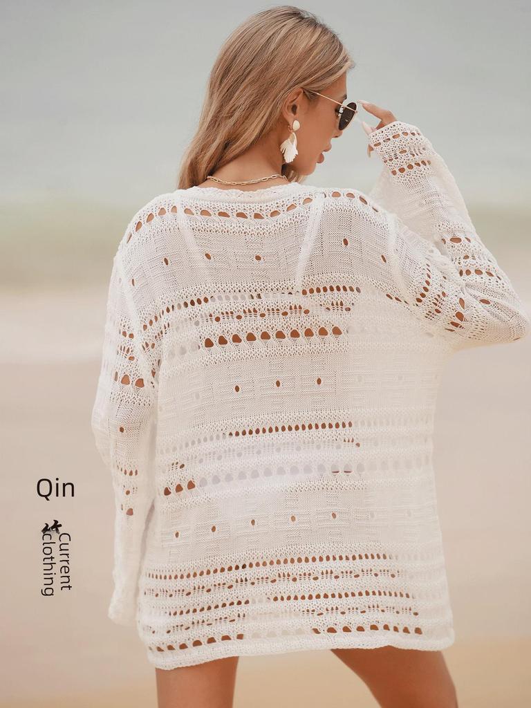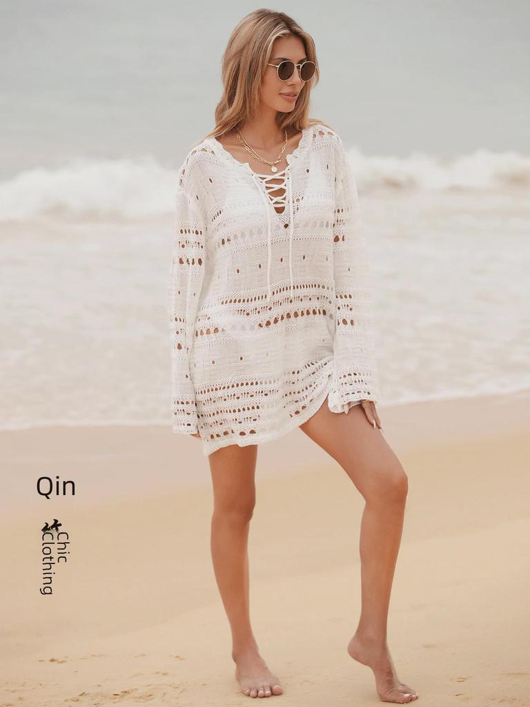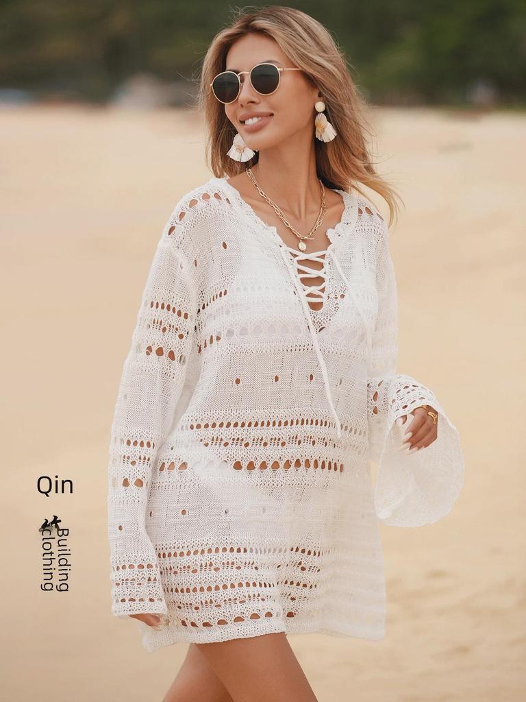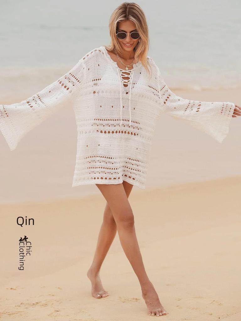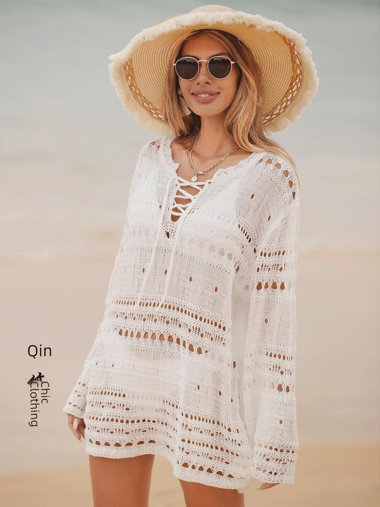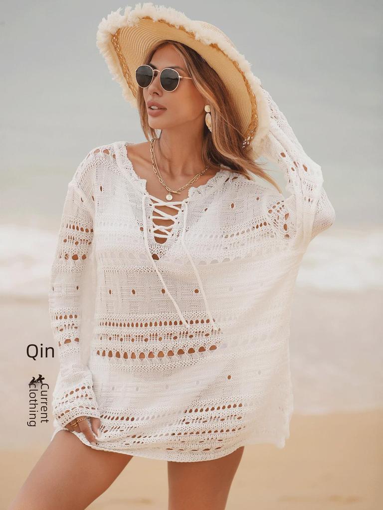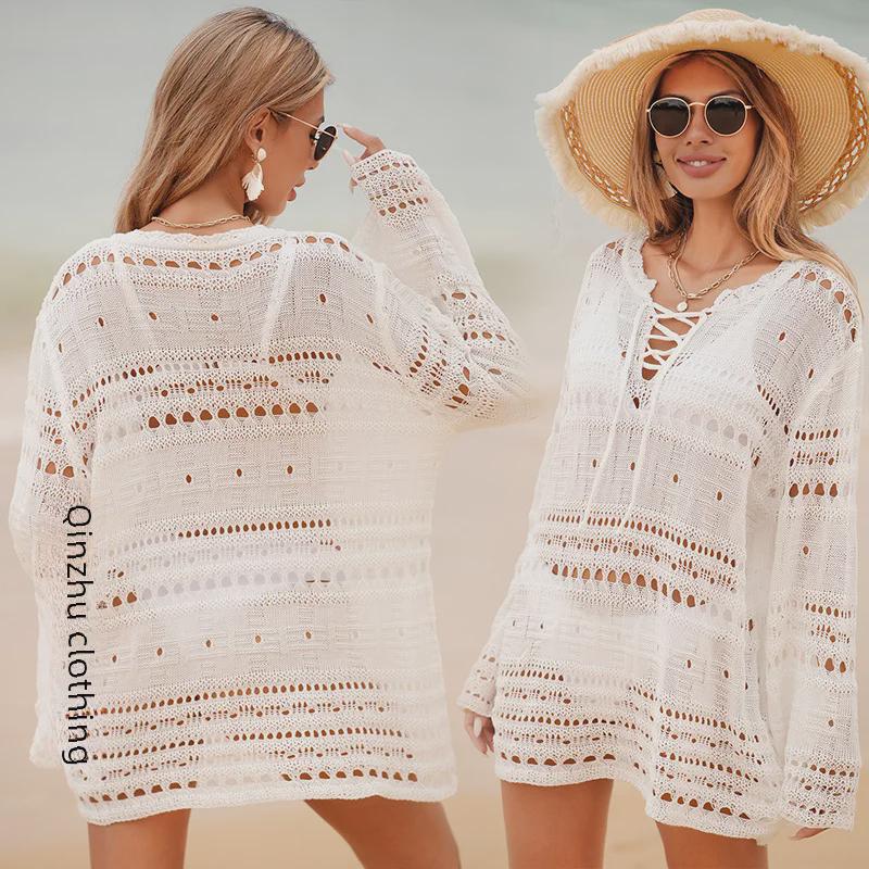 Женская пляжная блузка в европейском и американском стиле с рукавами-трубами и шнуровкой