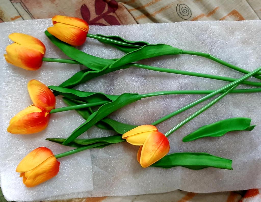 Из 5 тюльпанов 3 повреждены, у одного цветка лепесток отвалился, у 2-х зелёные листики от стебля отвалились, да и не удивительно - изготовление не качественное, листики плохо приклеены. Сами цветы меленькие, общая длина 32 см.