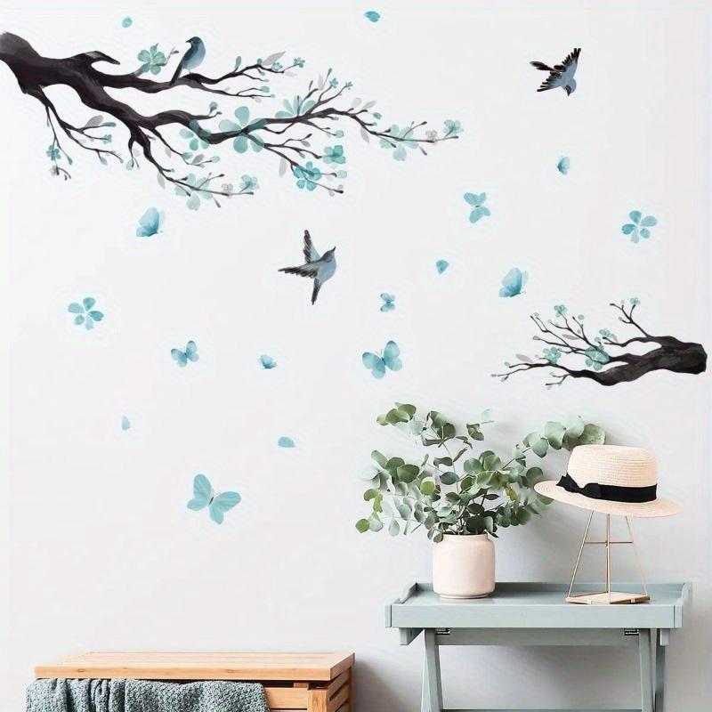 Синие Цветы Ветки Птицы Наклейки На Стены Цветы Наклейки На Стены Фон Гостиная Домашний Декор Обои Спальня Ребенок Обои